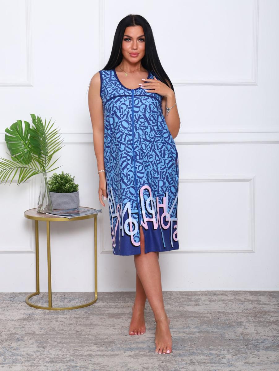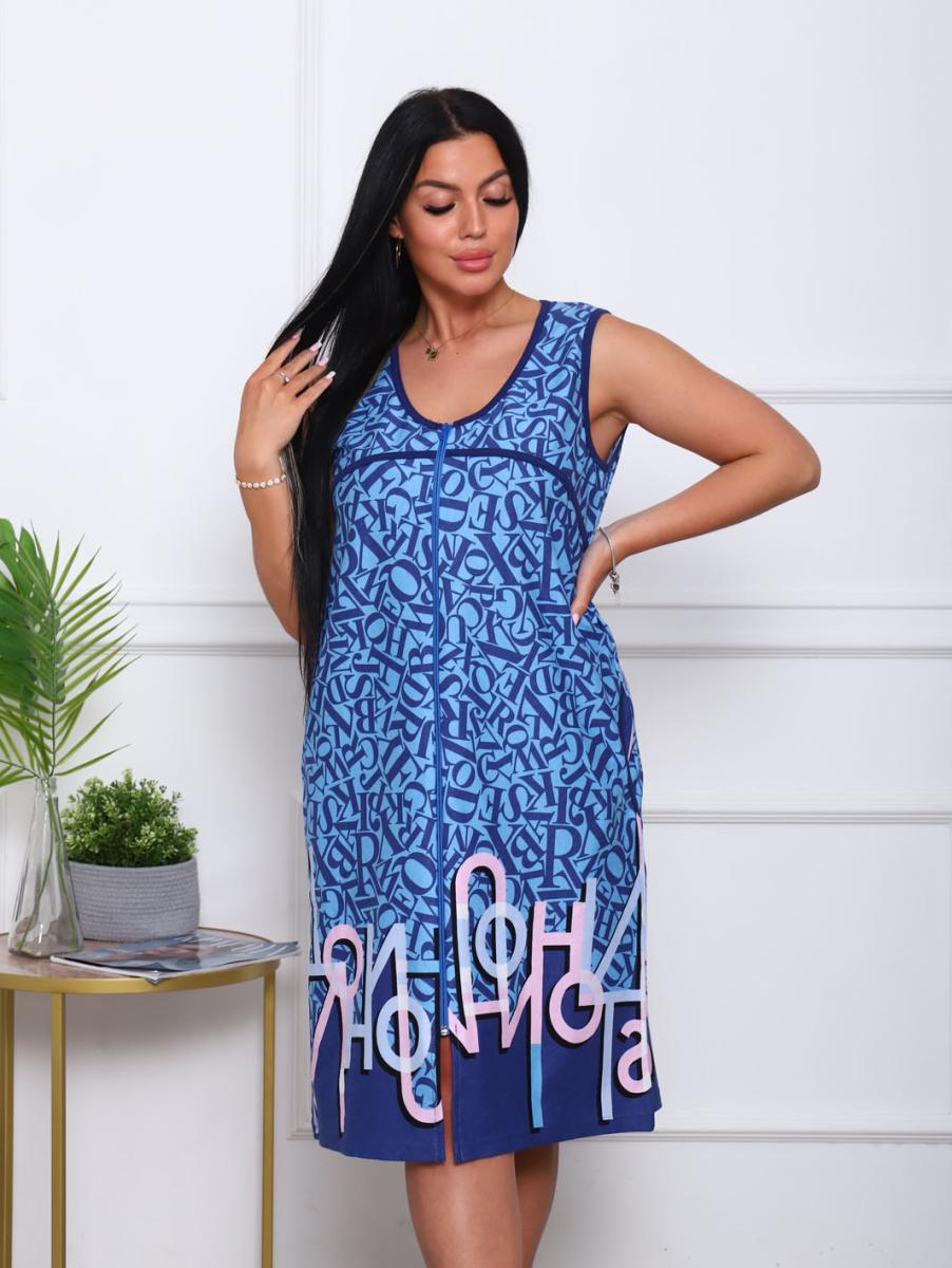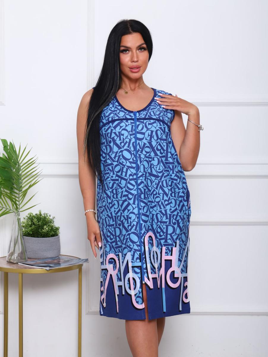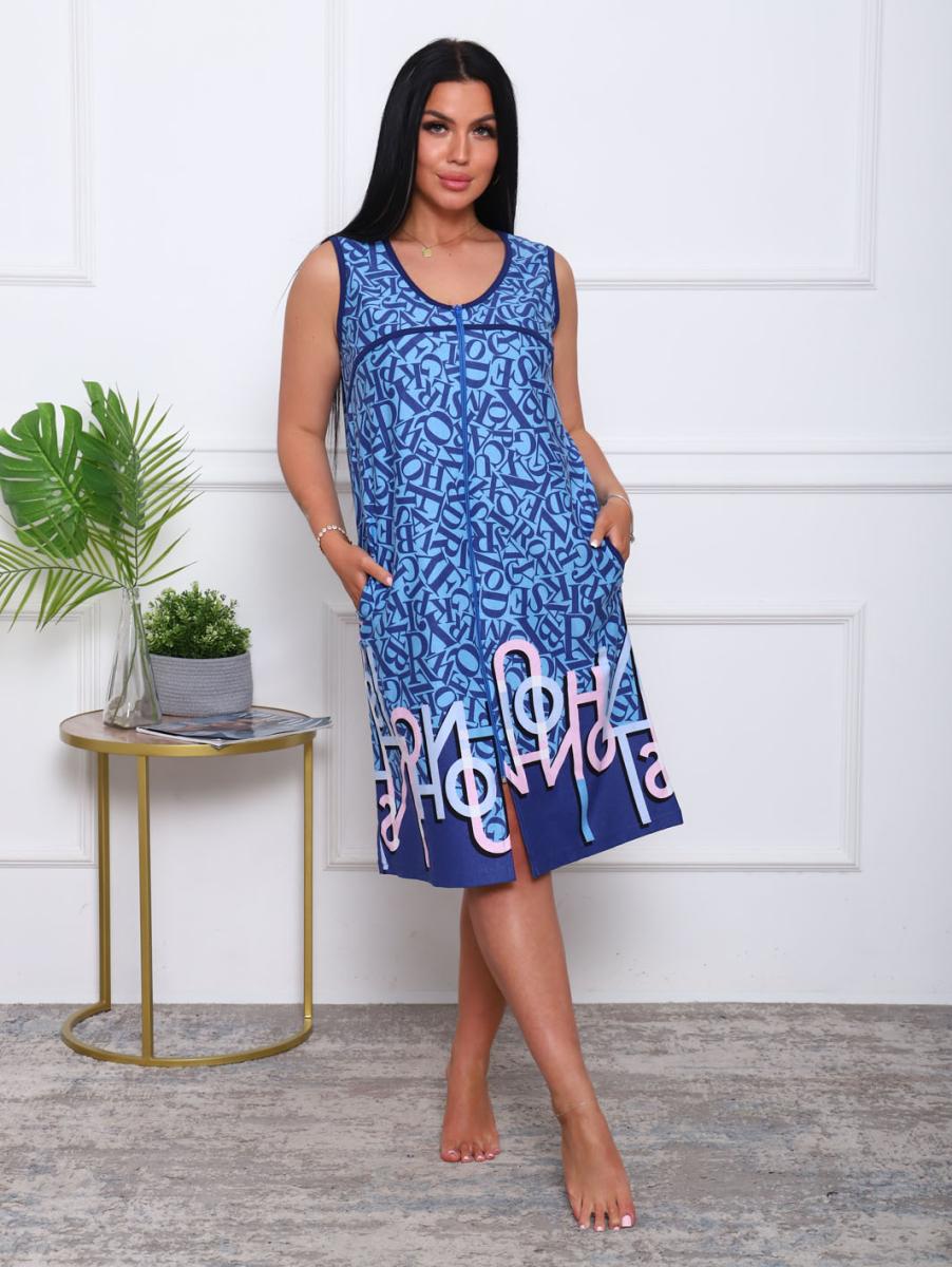 Дизайн халата представлен в нежном голубом цвете с оригинальным купоном, который добавляет выразительности и стиля. Безрукавная модель с отрезной кокеткой и карманами в швах обеспечивает свободу движений и возможность удобно хранить мелочи.