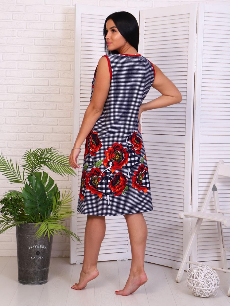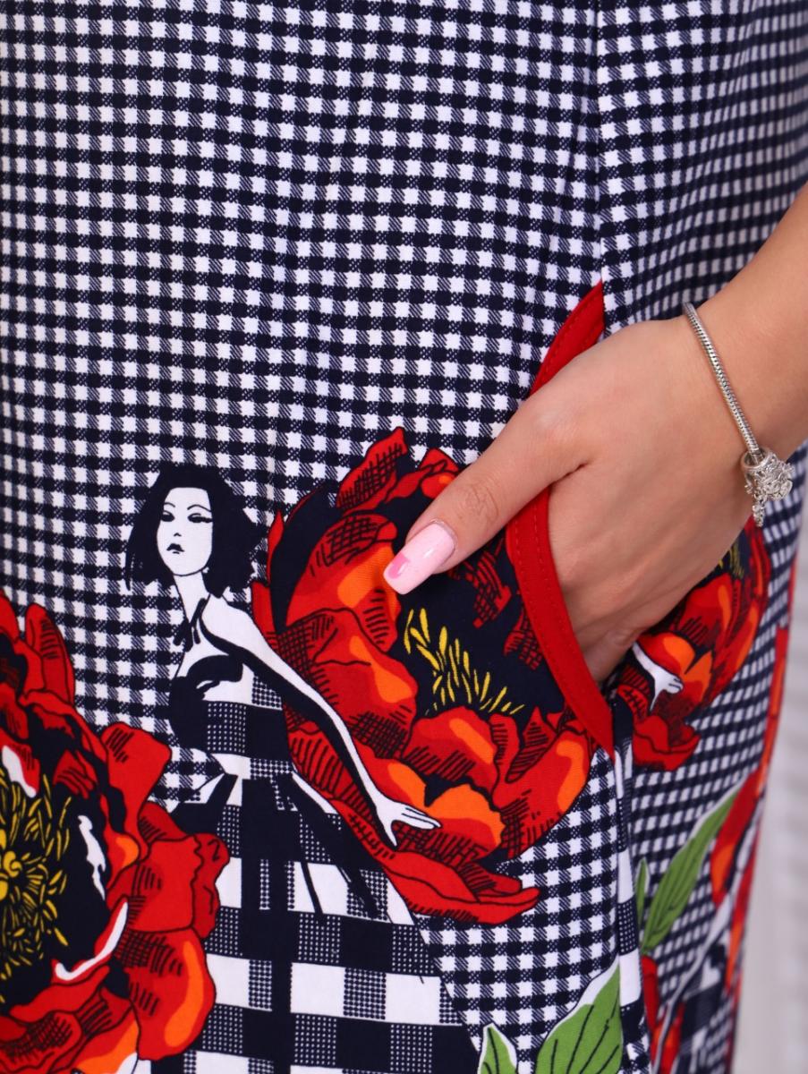 Особенности модели включают в себя карманы, аккуратно вшитые в боковые швы, что делает его не только красивым, но и практичным. Отрезная кокетка по линии груди добавляет элегантности, а отделка окантовкой из однотонной кулирки завершает образ.