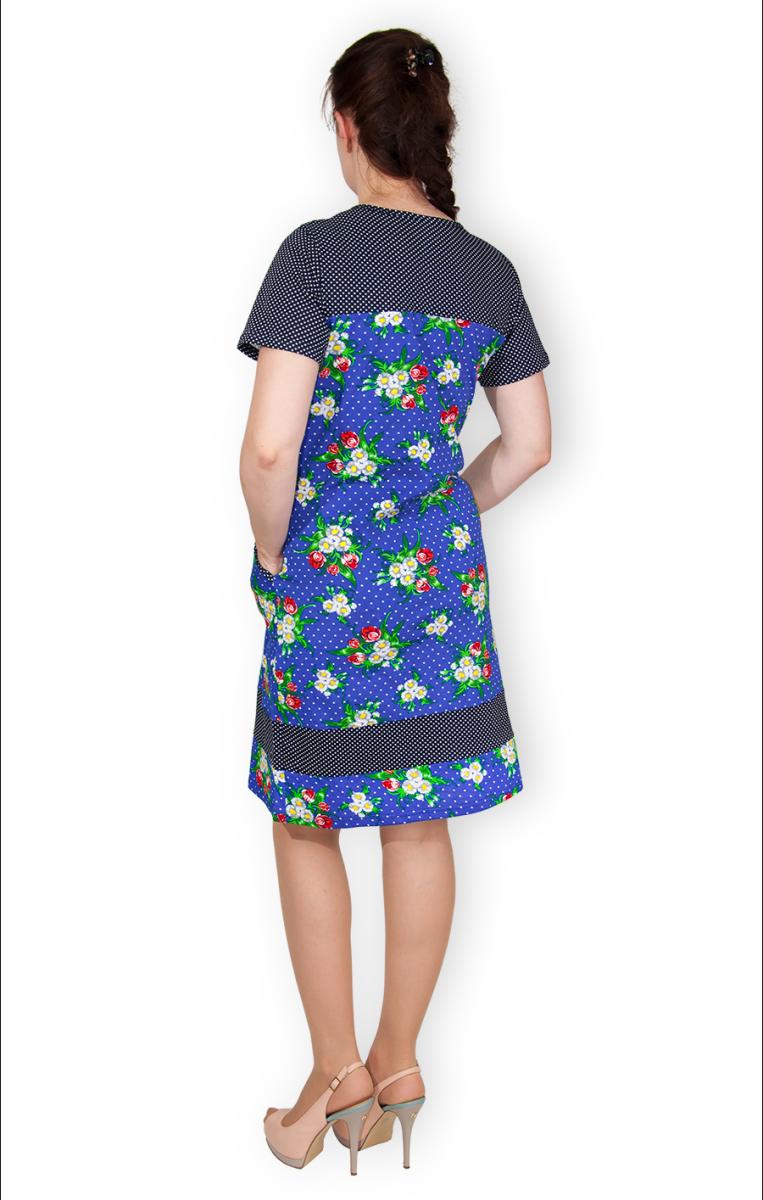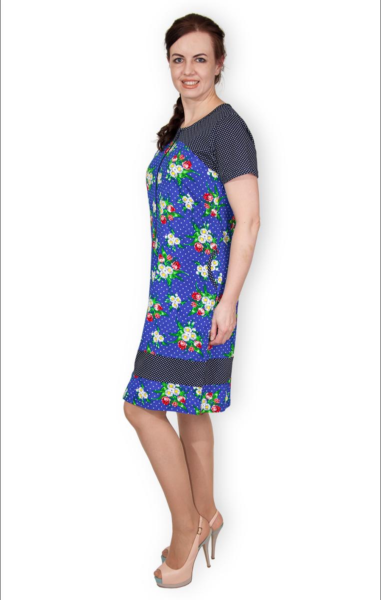 Элегантная расцветка в индиго с яркими цветами добавляет яркости и свежести, а втачные рукава с манжетами из однотонной кулирки придают халату завершенный вид.