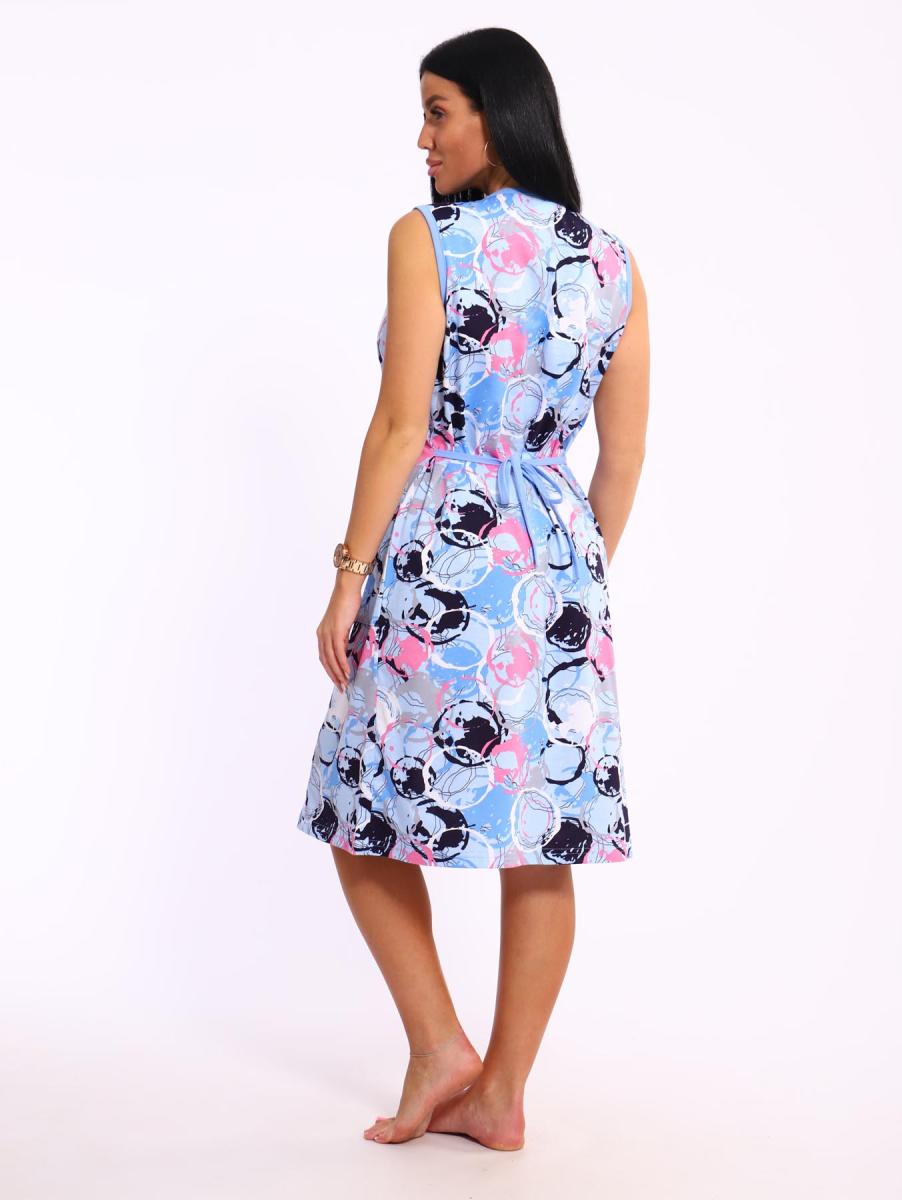 Спинка халата целая, что придаёт ему элегантный вид, а боковые швы с завязками из однотонной окантовки в виде пояса создают изысканный силуэт. Яркая голубая расцветка с нежными акцентами в виде цветочных узоров добавит яркости вашему образу.