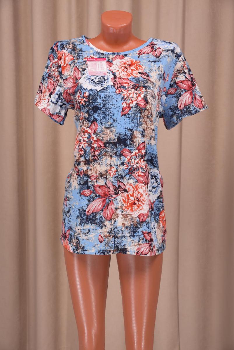 Яркий цветочный принт на фоне голубого оттенка придаст вашему образу свежесть и нежность. Футболка имеет свободный крой, что позволяет легко комбинировать ее с различными предметами одежды, от джинсов до юбок.