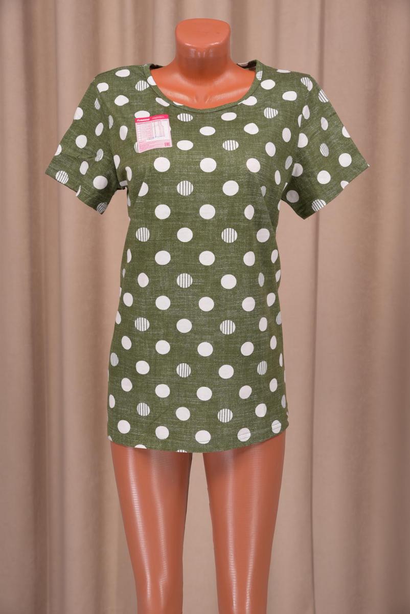 Яркий зеленый цвет в сочетании с крупными белыми горошками придаст вашему образу свежесть и игривость. Футболка имеет удобный крой с короткими рукавами и круглым вырезом, что обеспечивает свободу движений и комфорт на протяжении всего дня.