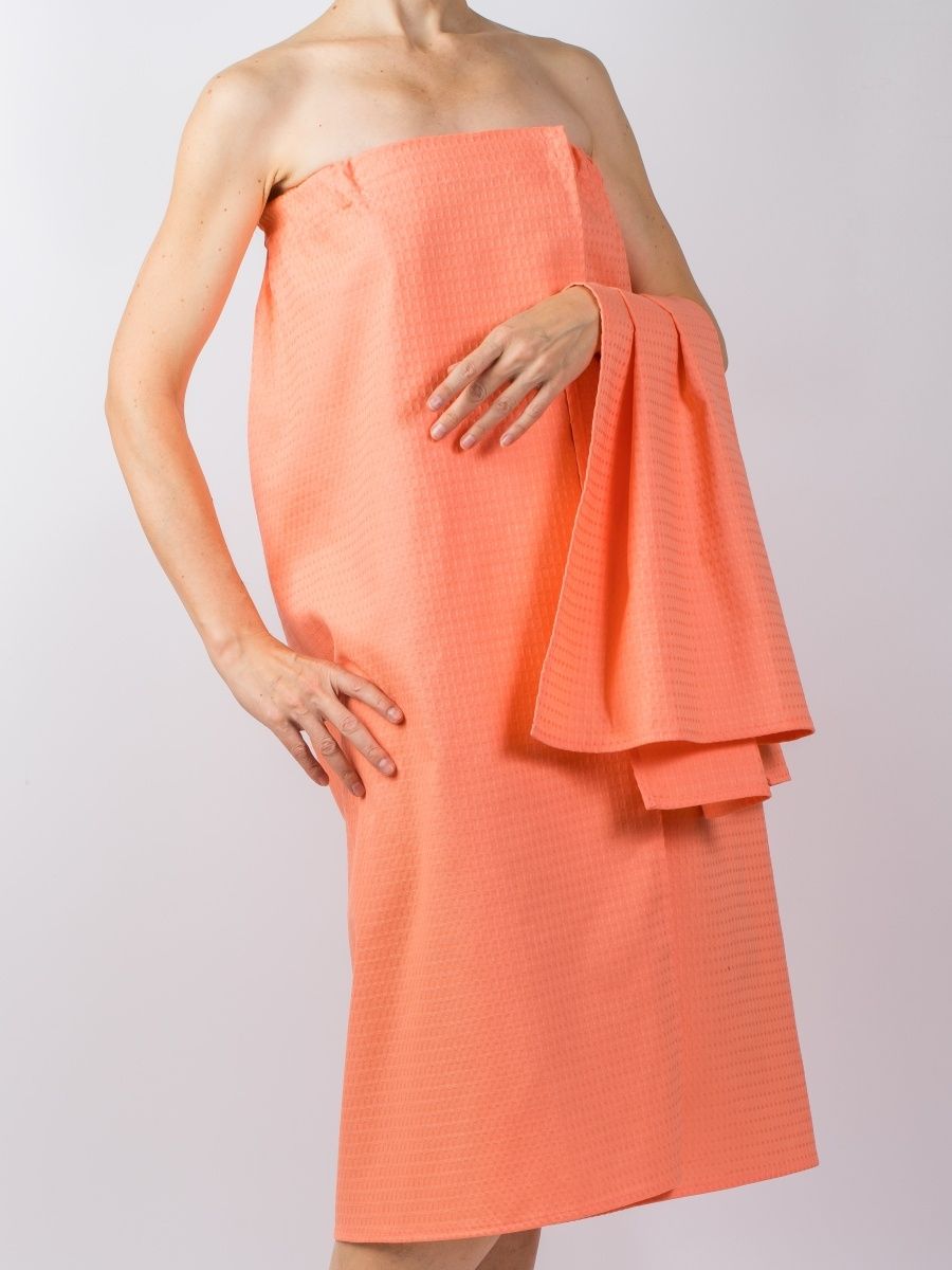 Женский набор для бани и сауны состоит из двух изделий: запашное банное полотенце для тела и полотенце для волос. Банные полотенца сшиты из вафельного полотна (100% хлопок) - легко впитывают влагу, являются быстросохнущими.