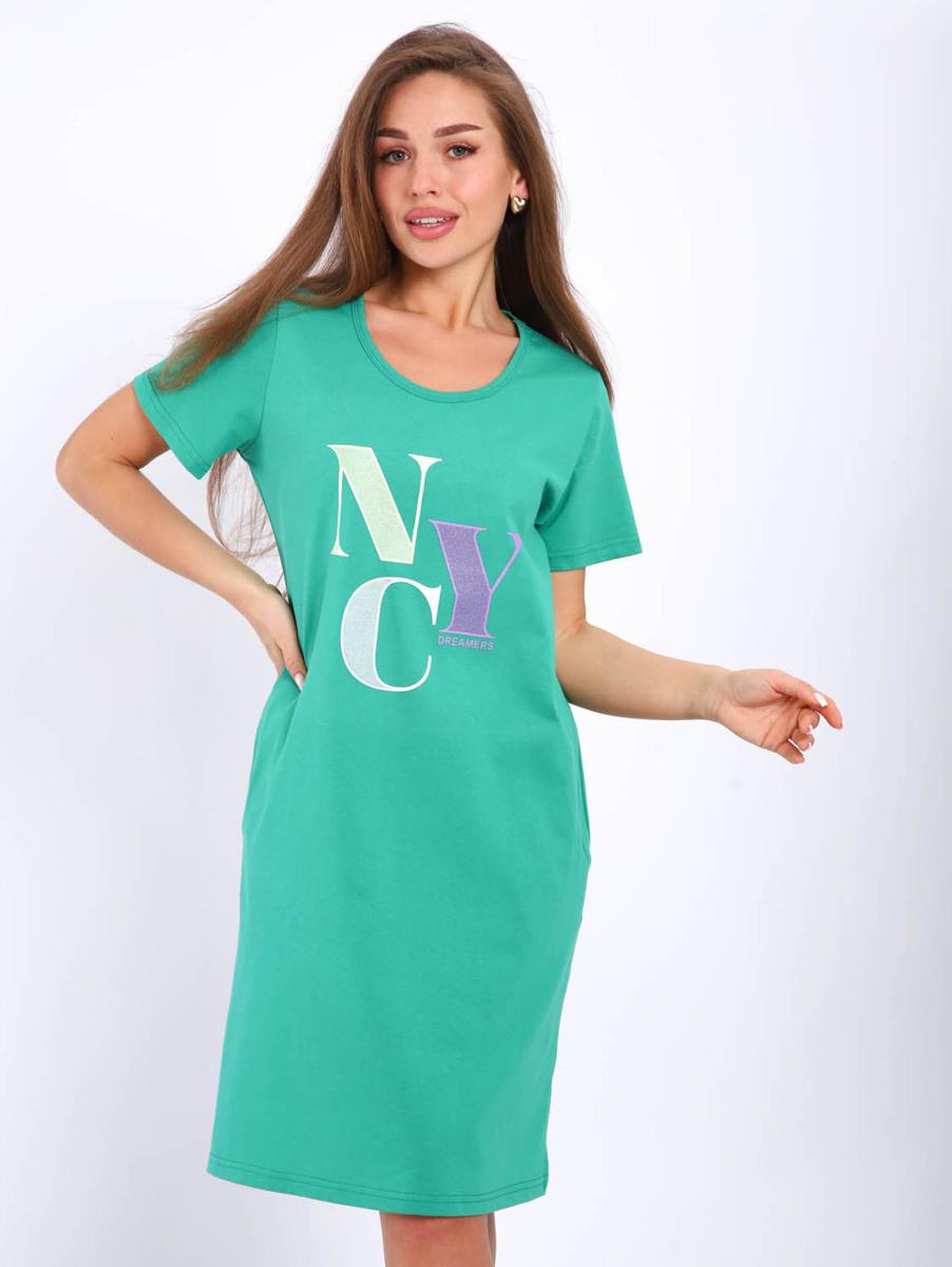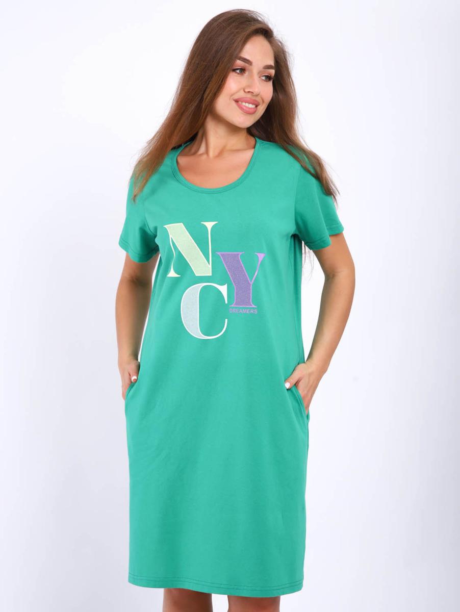 Туника женская выполнена из трикотажного полотна. Туника прямого силуэта, рукав короткий, горловина круглая окантована. Прорезные карманы в боковых швах, на полочке выполнена печать. Разрезы в боковых швах.