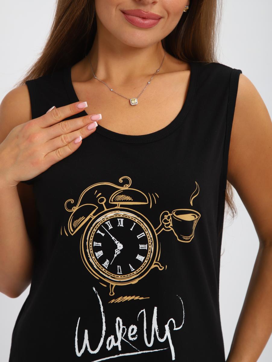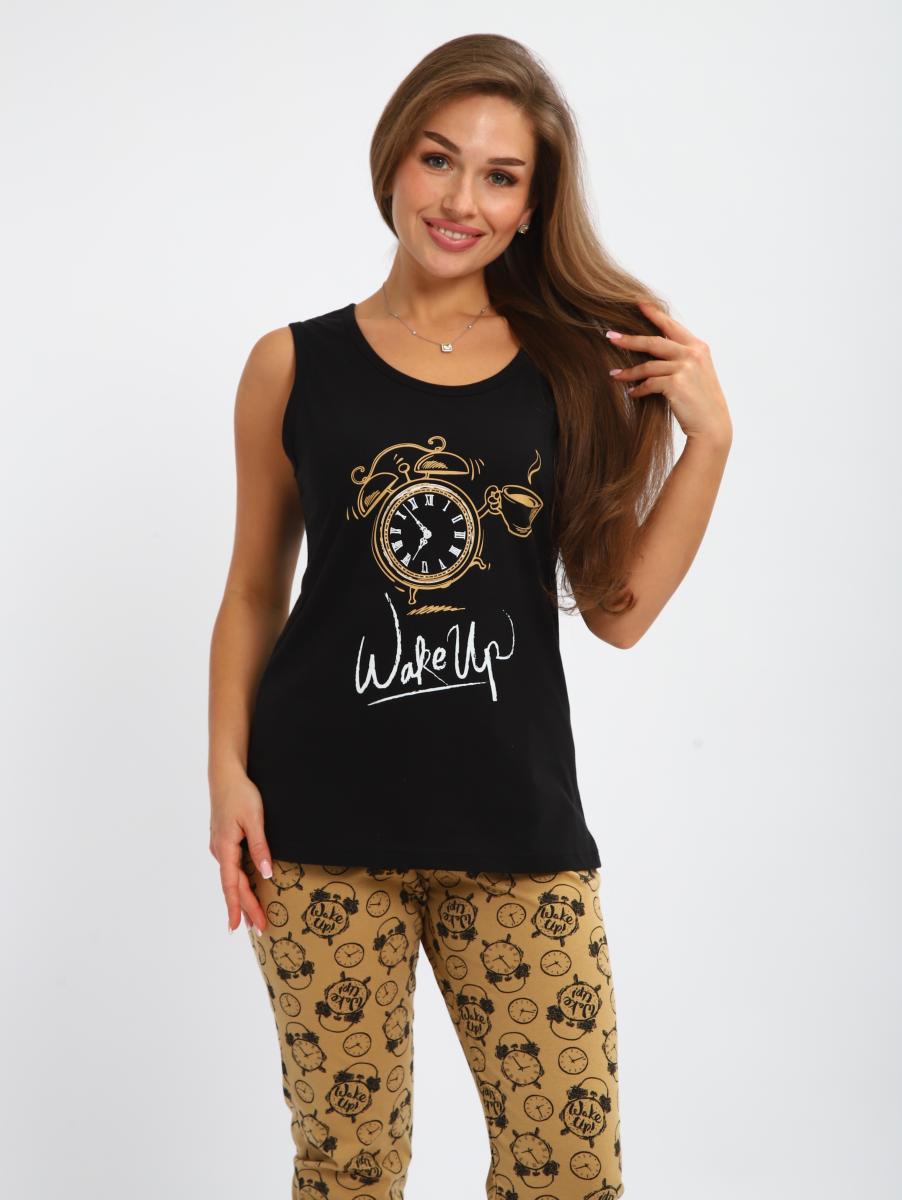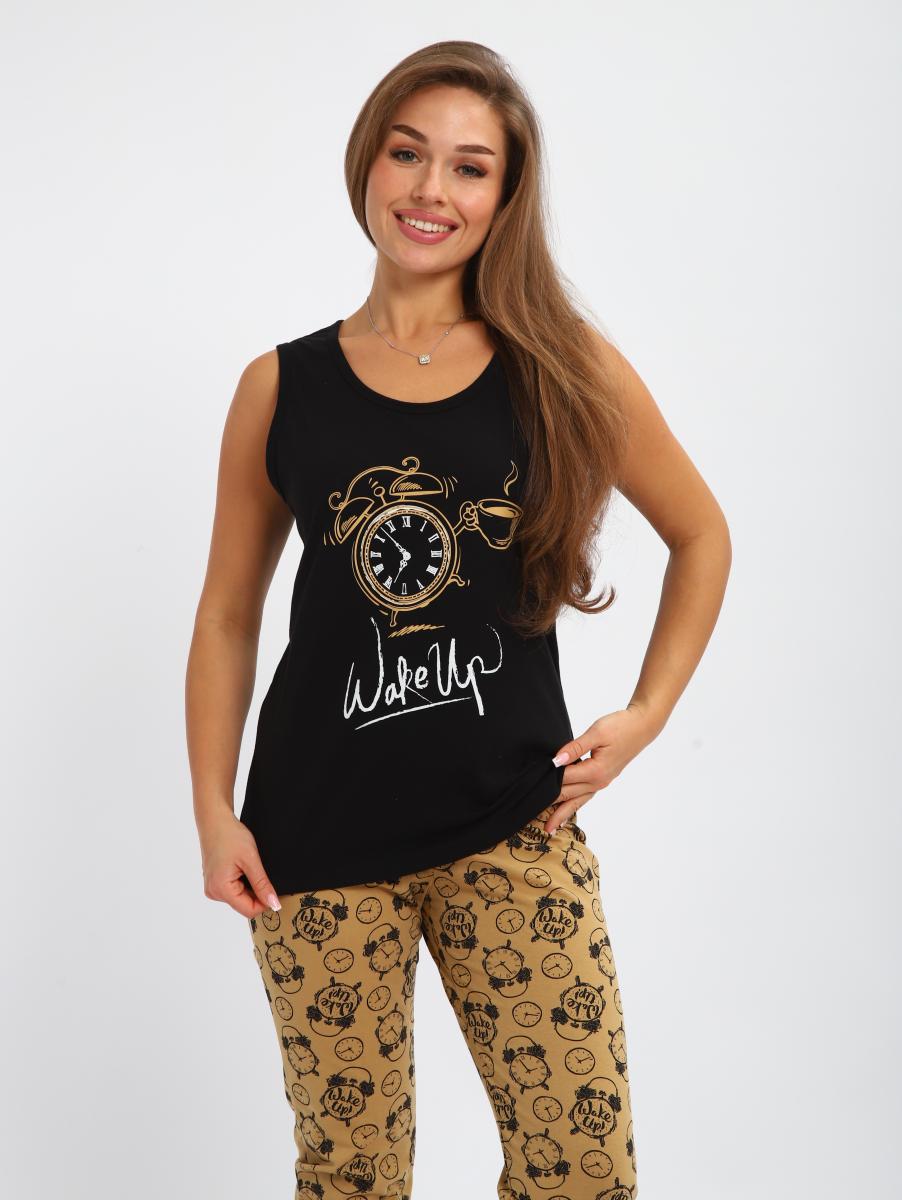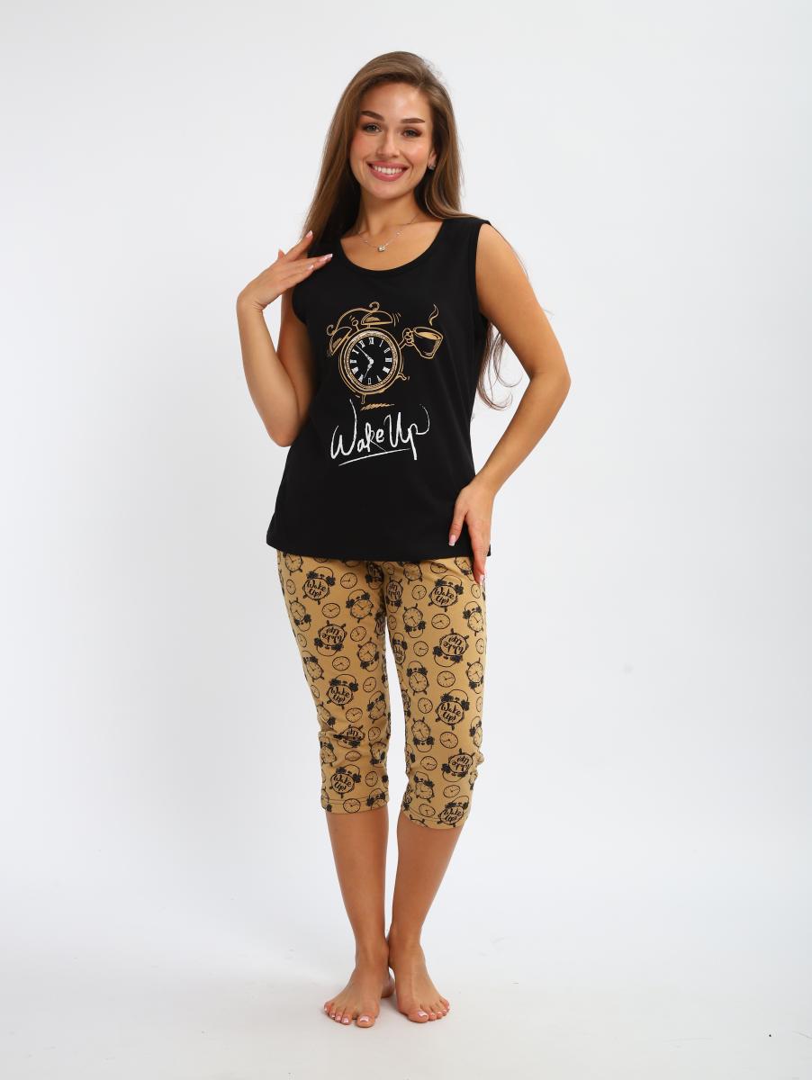 Пижама женская выполнена из трикотажного полотна кулирка. пижама состоит из мацки и бридж. Майка свободного силуэта. горловина и прйма окантованы. На полочке выполнена печать. Бриджи прямые, пояс на резинки. длина ниже колен.