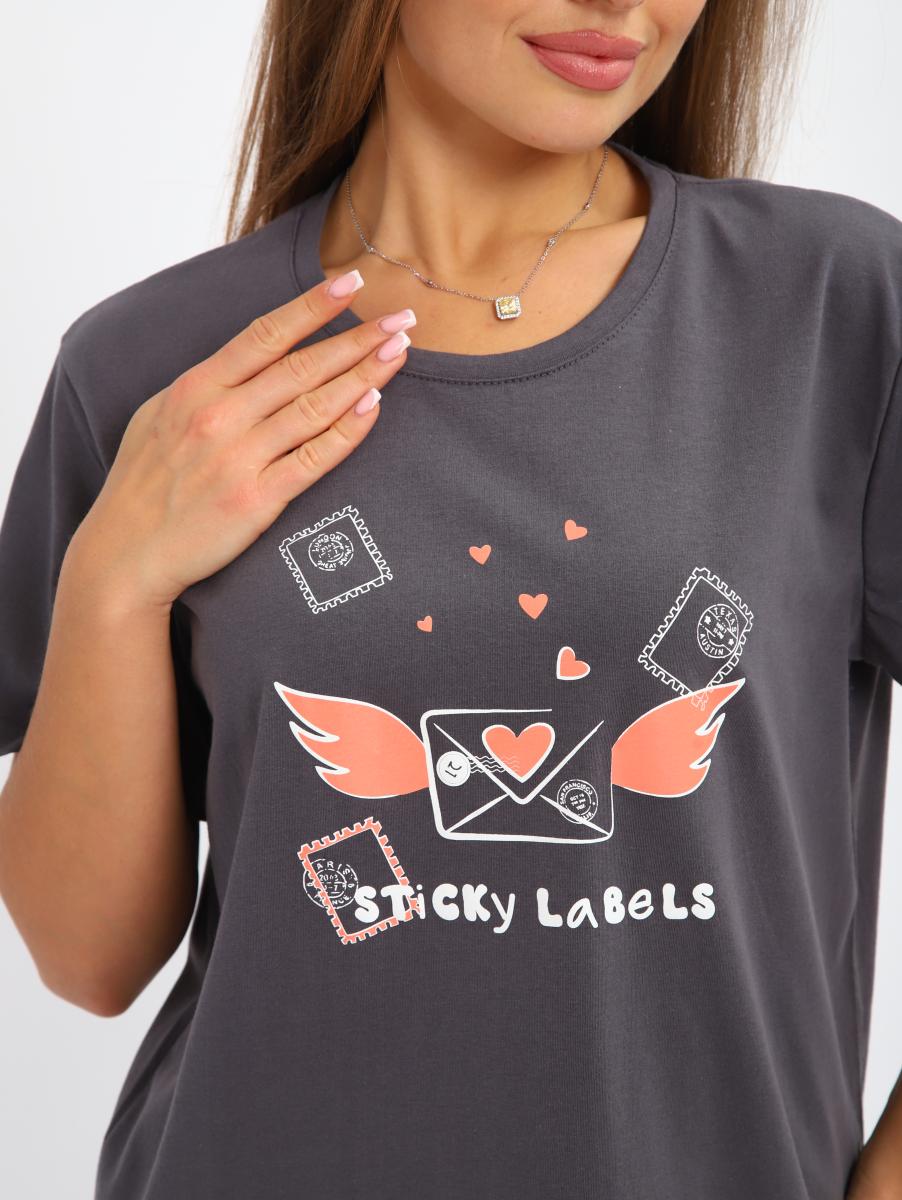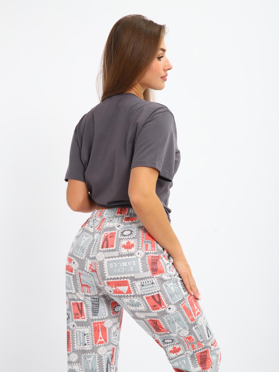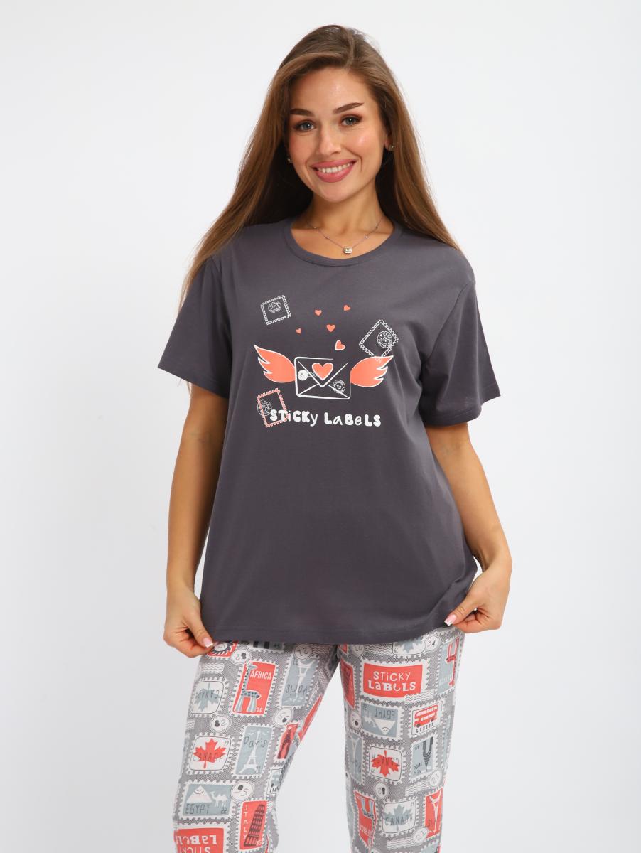 Костюм женский выполнен из трикотажного полотна кулирка. Костюм состоит из футболки и бридж. Футболка свободного силуэта, рукав втачной короткий, на полочке выполнена печать. Бриджи прямые, пояс на широкой резинке, карманы по бокам.