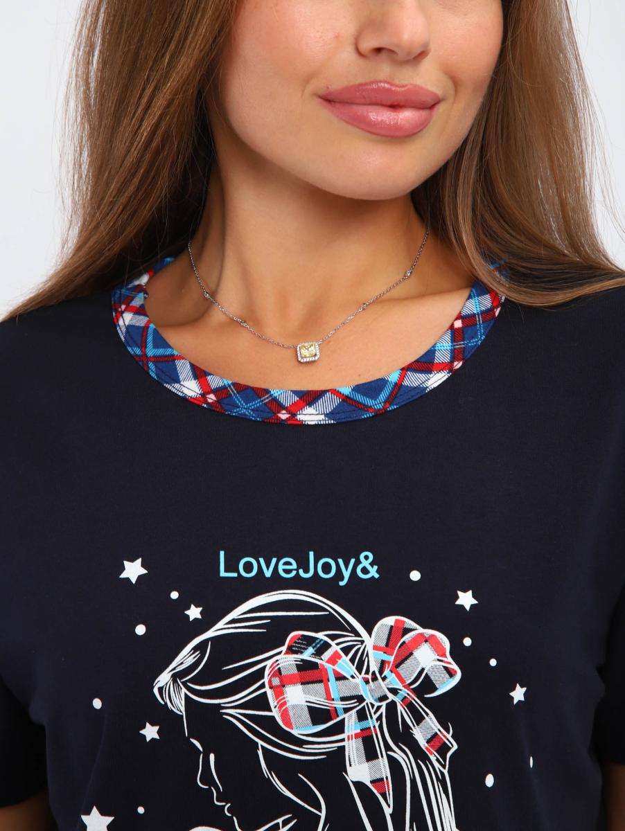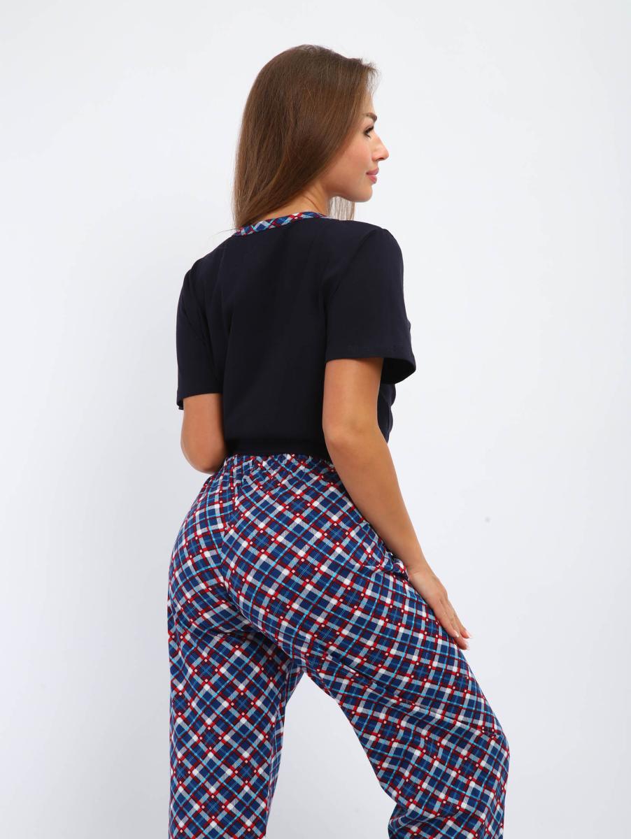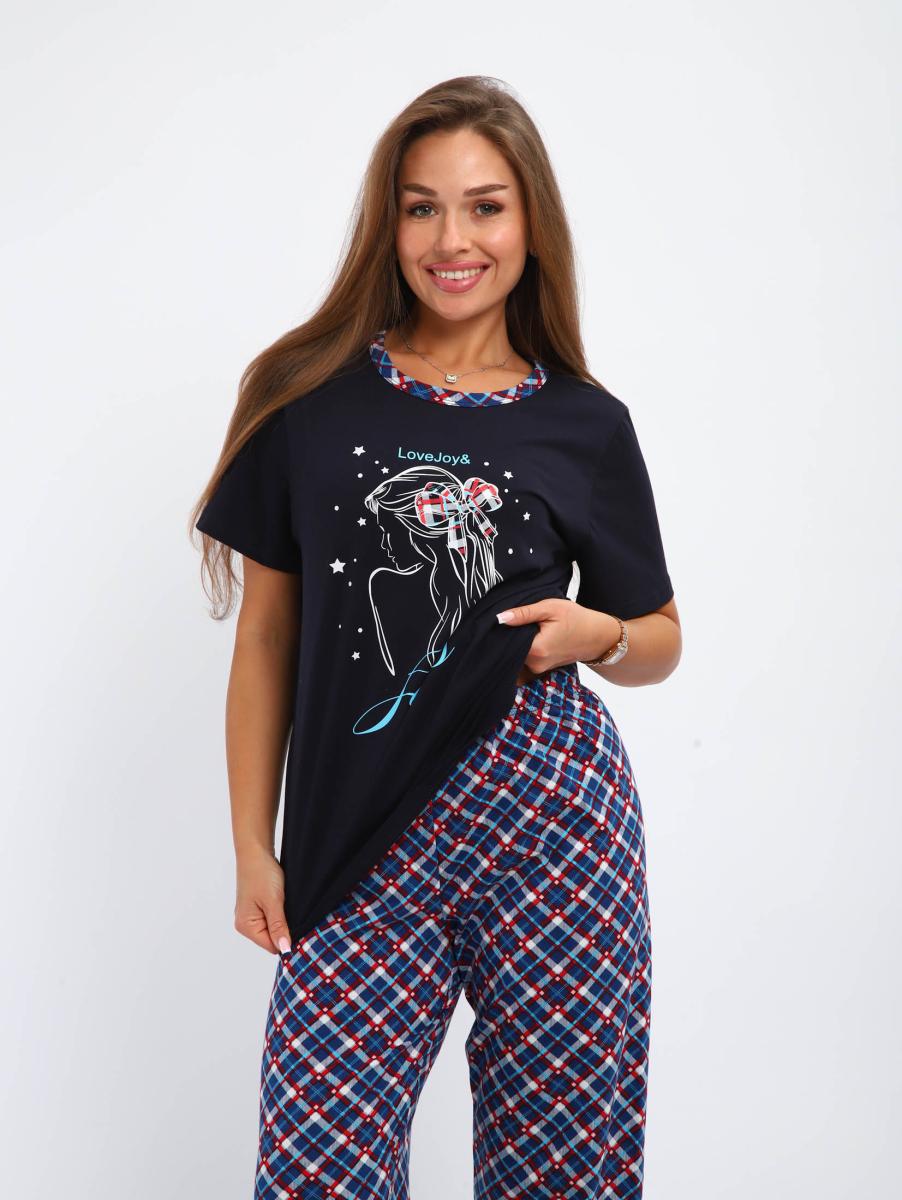 Костюм женский выполнен из трикотажного полотна кулирка. Костюм состоит из футболки и брюк. Футболка свободного силуэта, с коротким рукавом на полочке выполнена печать. Брюки прямого кроя, пояс на резинке