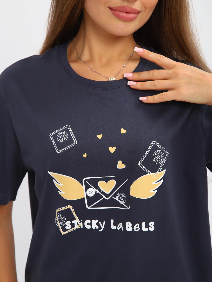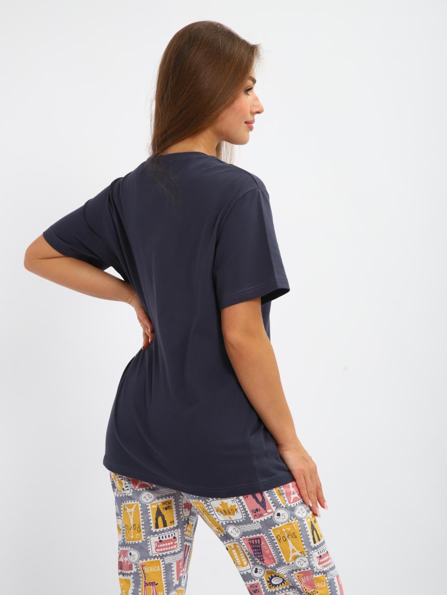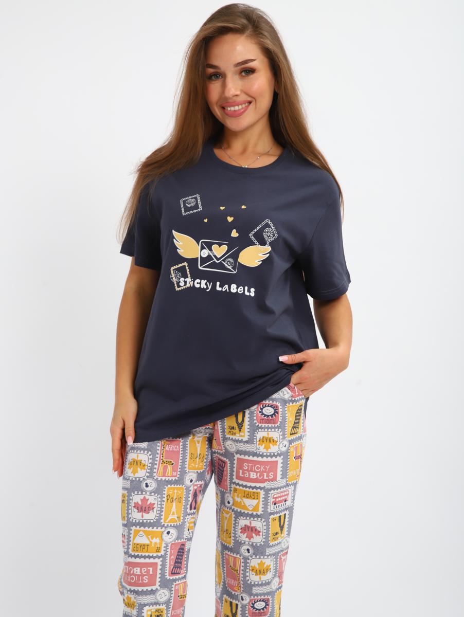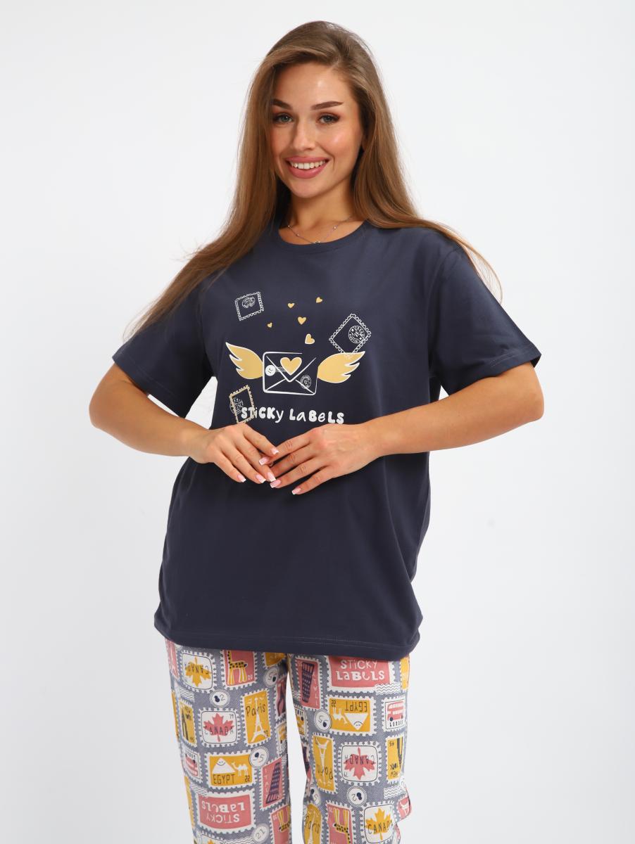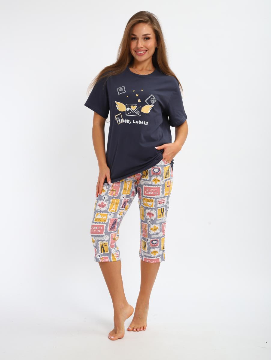 Костюм женский выполнен из трикотажного полотна кулирка. Костюм состоит из футболки и бридж. Футболка свободного силуэта, рукав втачной короткий, на полочке выполнена печать. Бриджи прямые, пояс на широкой резинке, карманы по бокам.