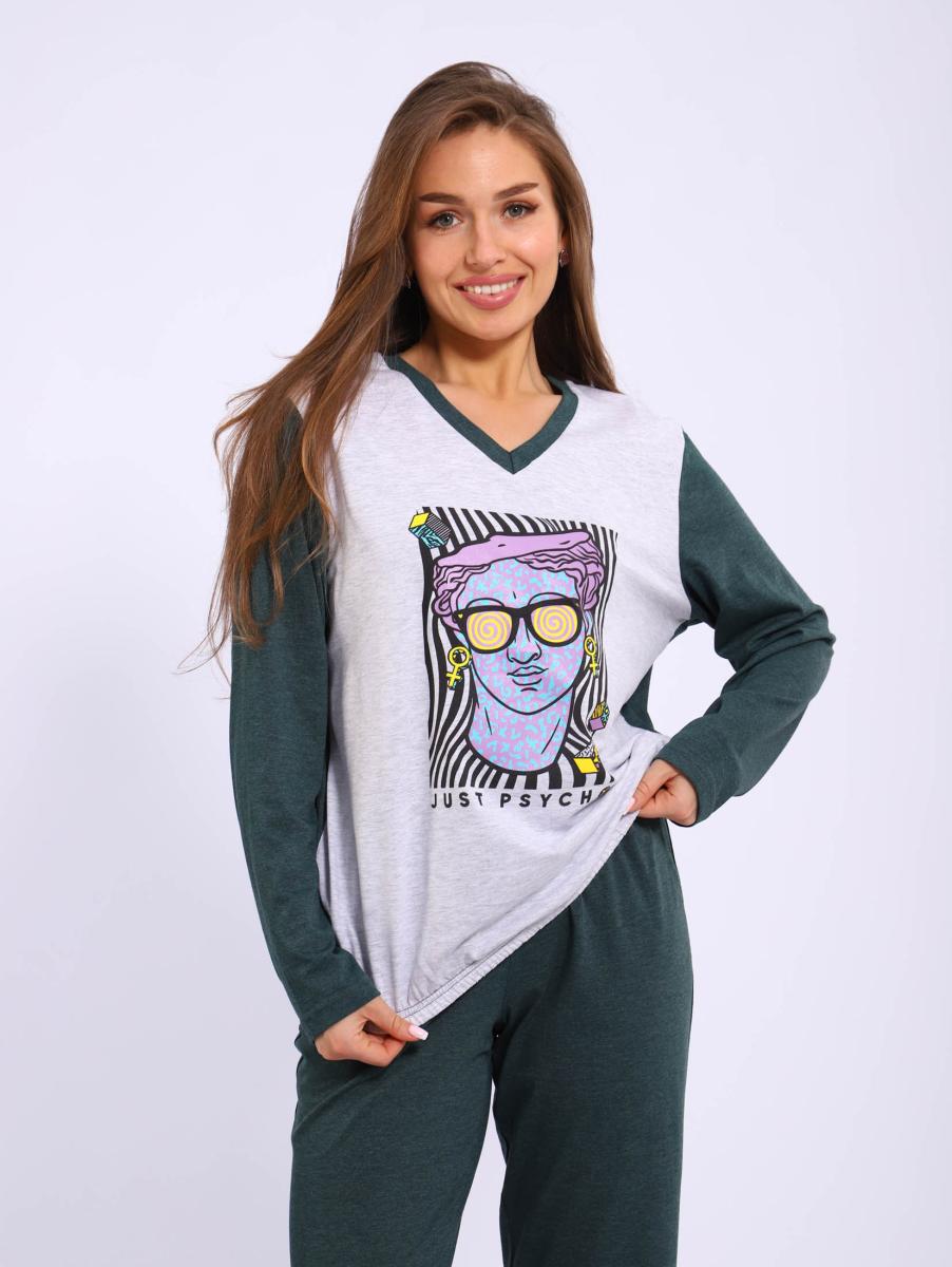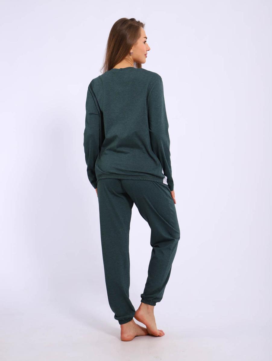 Костюм женский выполнен из меланжированной кулирка. Костюм состоит из кофты и брюк. Кофта с длинным рукавом, по низу на резинке, вырез горловины намыс. На полочке выполнена печать. Брюки свободного силуэта, пояс на широкой резинке, по бокам карманы.