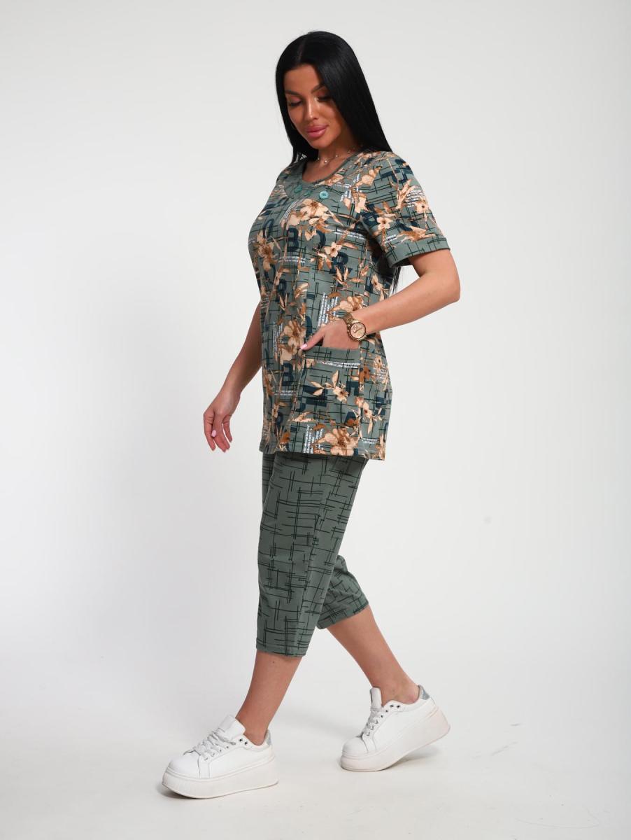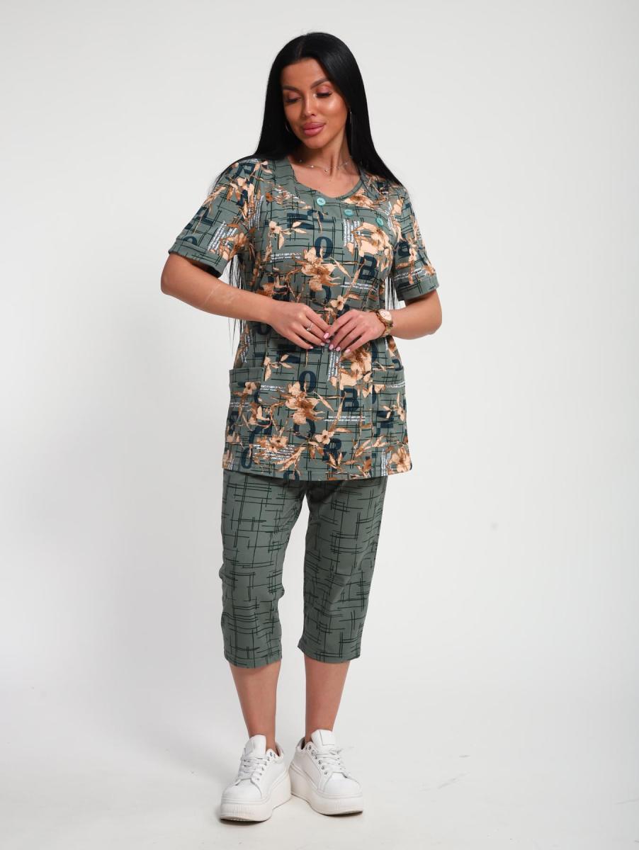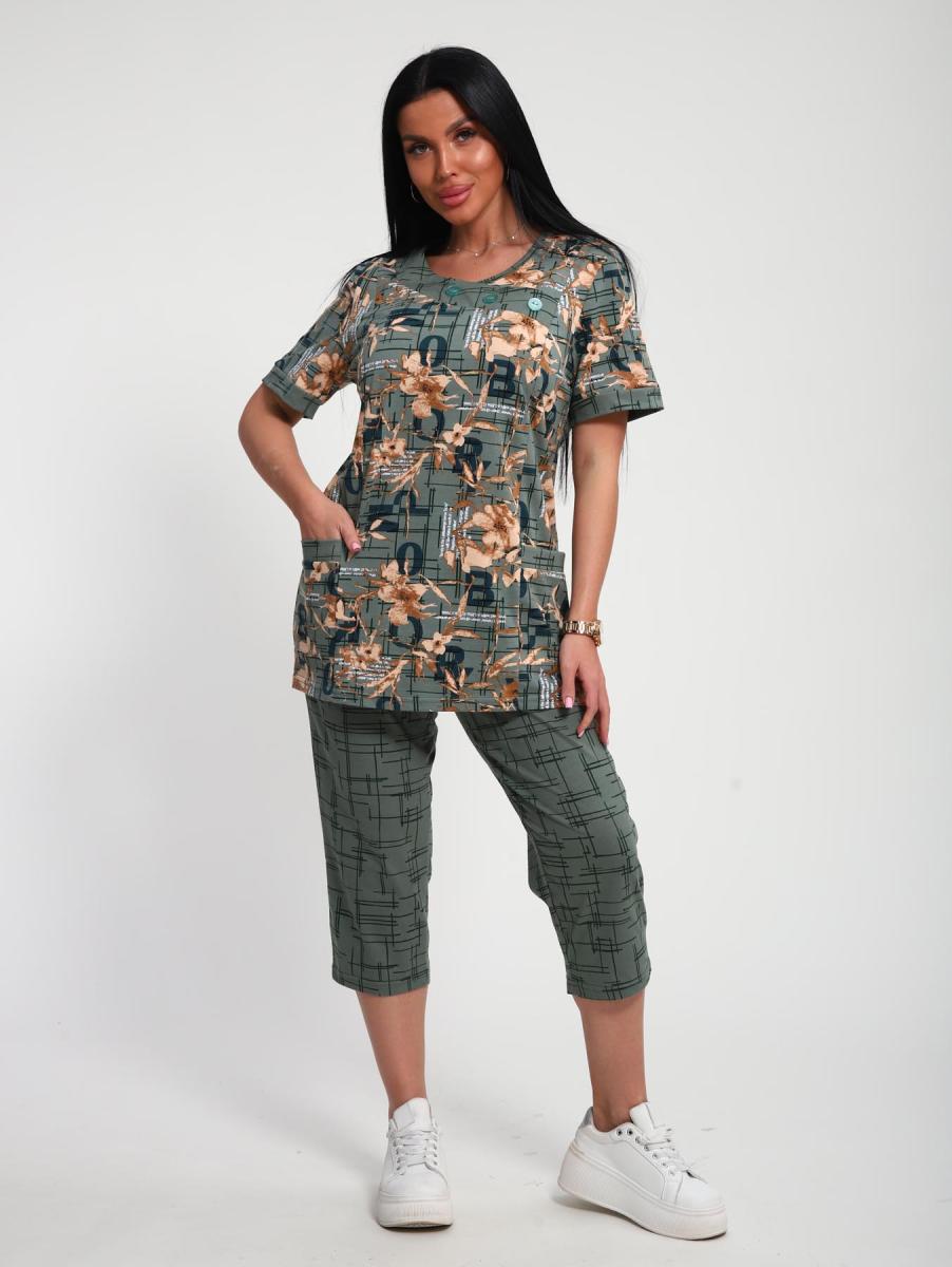Костюм трикотажный с бриджами (ткани - компаньоны). Очень удобный женский комплект с карманами для дома, отдыха и путешествий. Бриджи на высокой посадке - комфортный длины. Футболка с втачным рукавом и планкой, по горловине пришита обтачка с декоративными пуговицами.