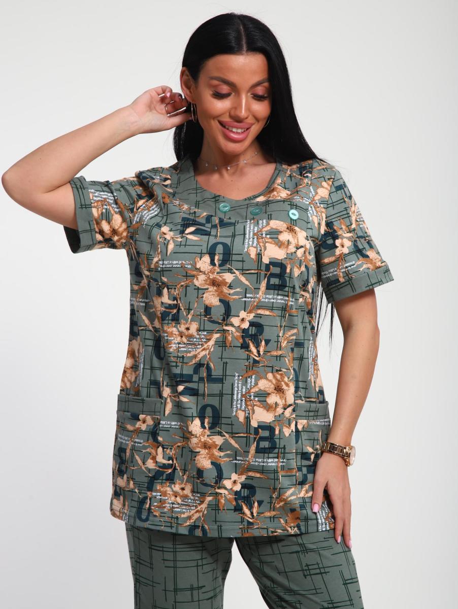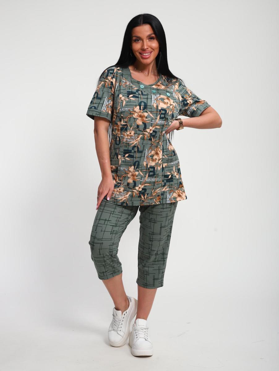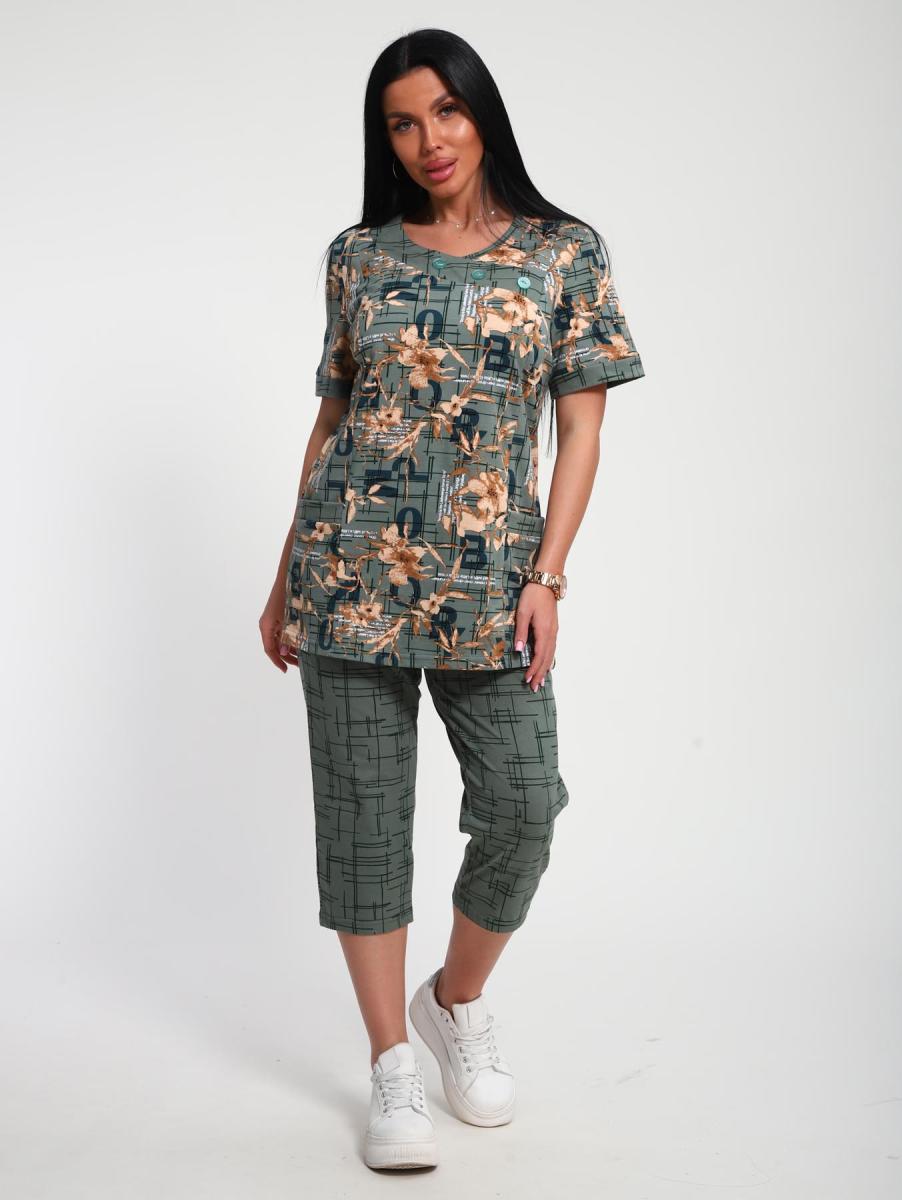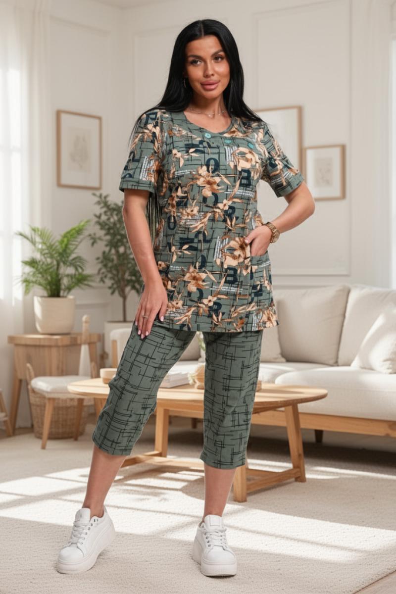 Костюм трикотажный с бриджами (ткани - компаньоны). Очень удобный женский комплект с карманами для дома, отдыха и путешествий. Бриджи на высокой посадке - комфортный длины. Футболка с втачным рукавом и планкой, по горловине пришита обтачка с декоративными пуговицами.