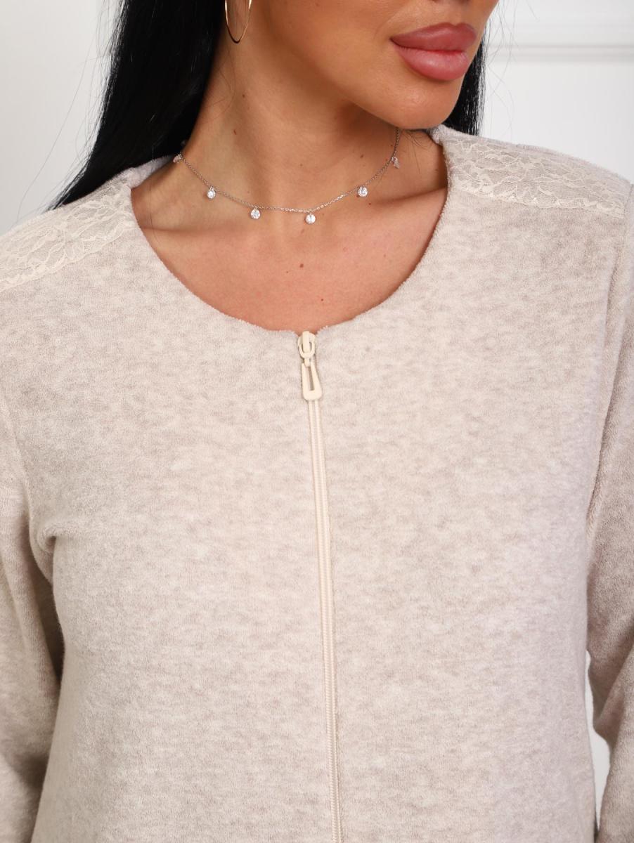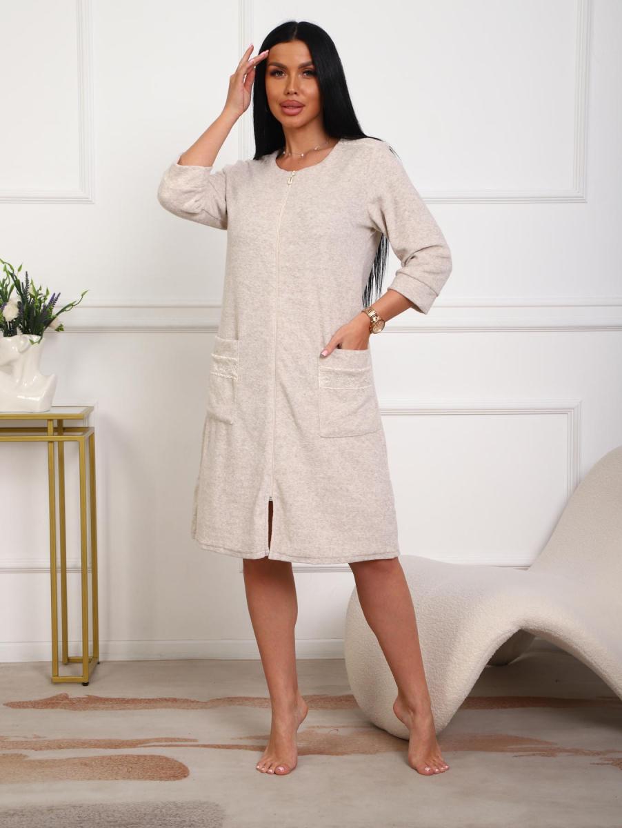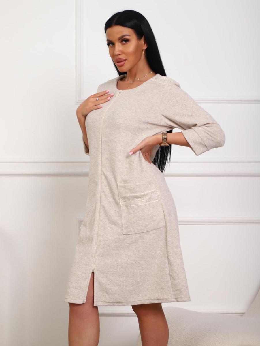 Халат махровый, однотонный на молнии. Отделка - эластичное кружево. Рукав втачной 3/4 с манжетом.