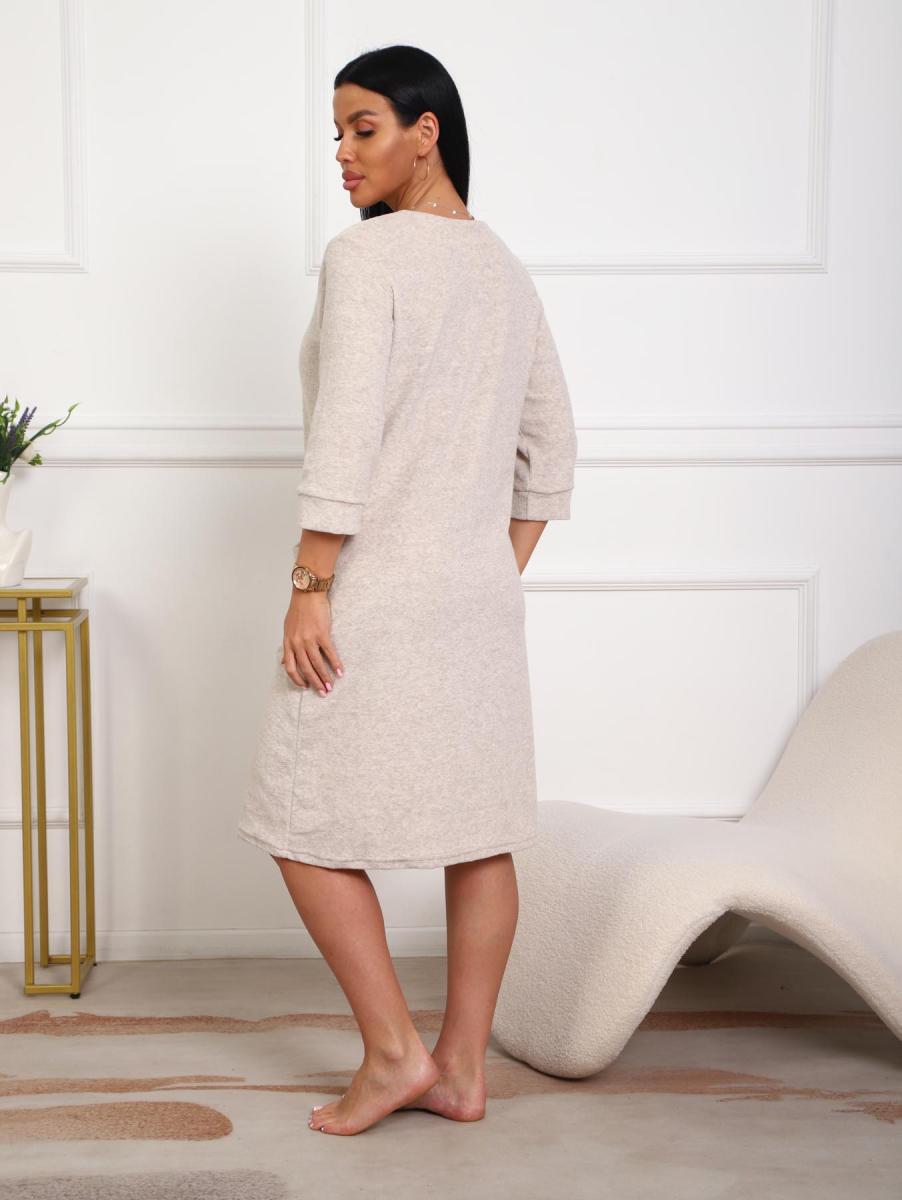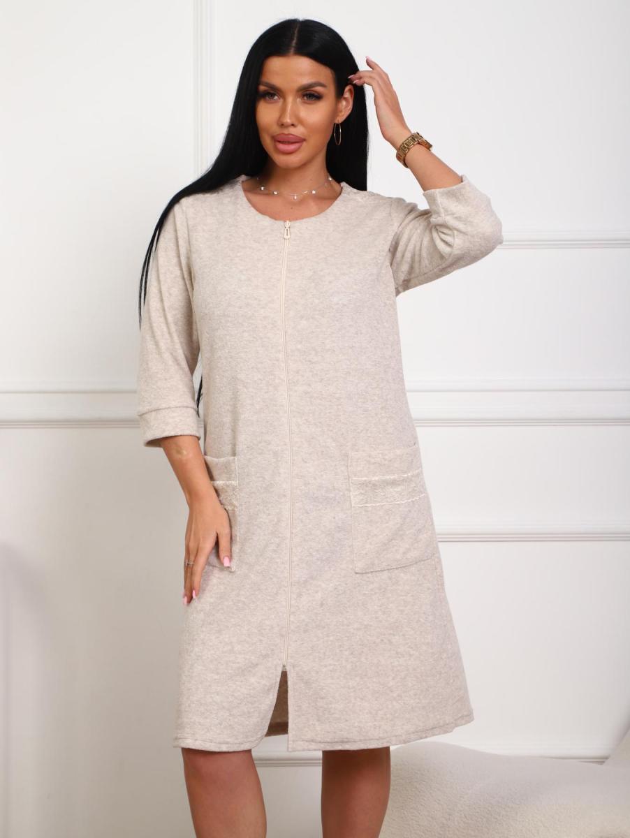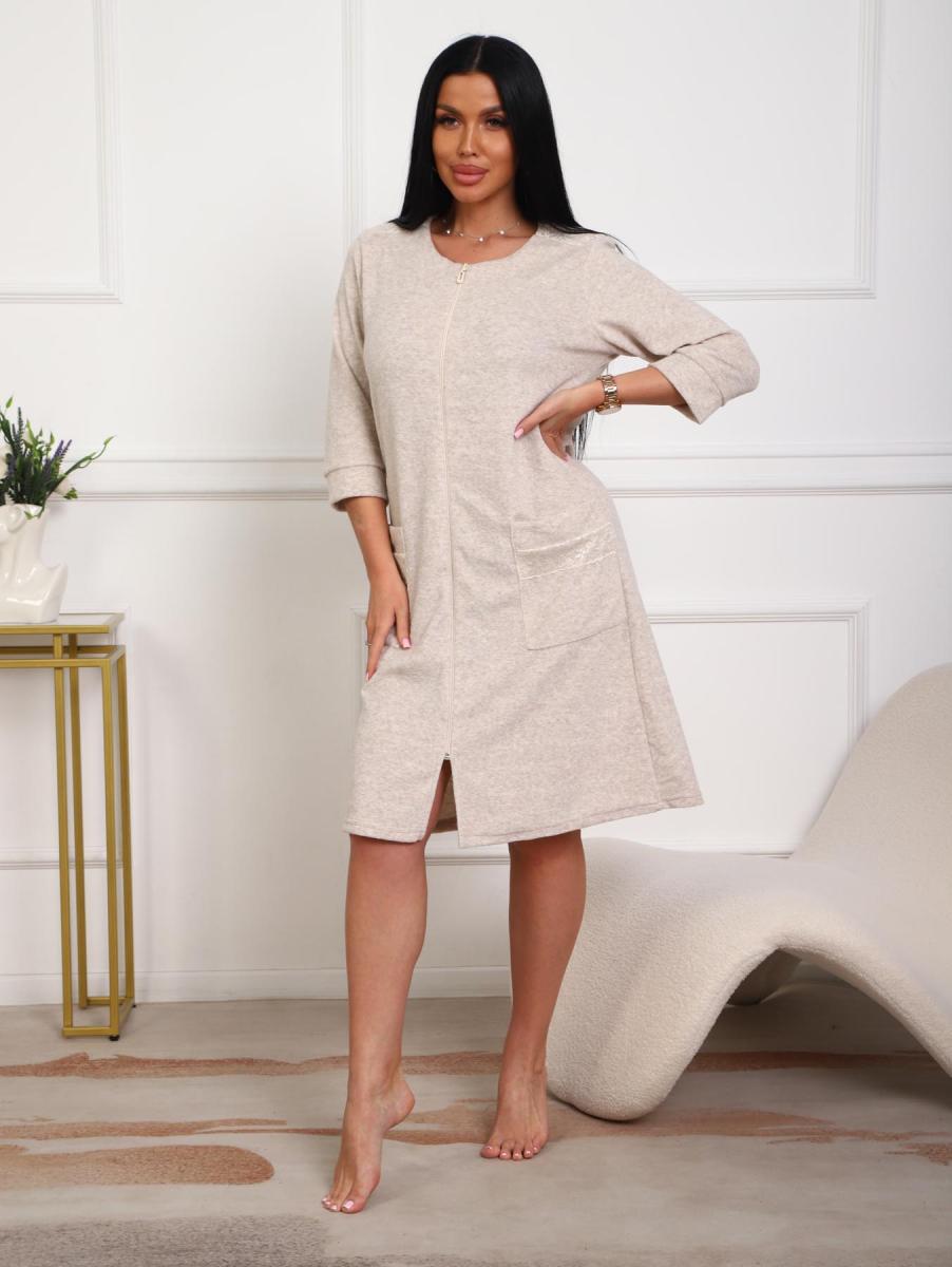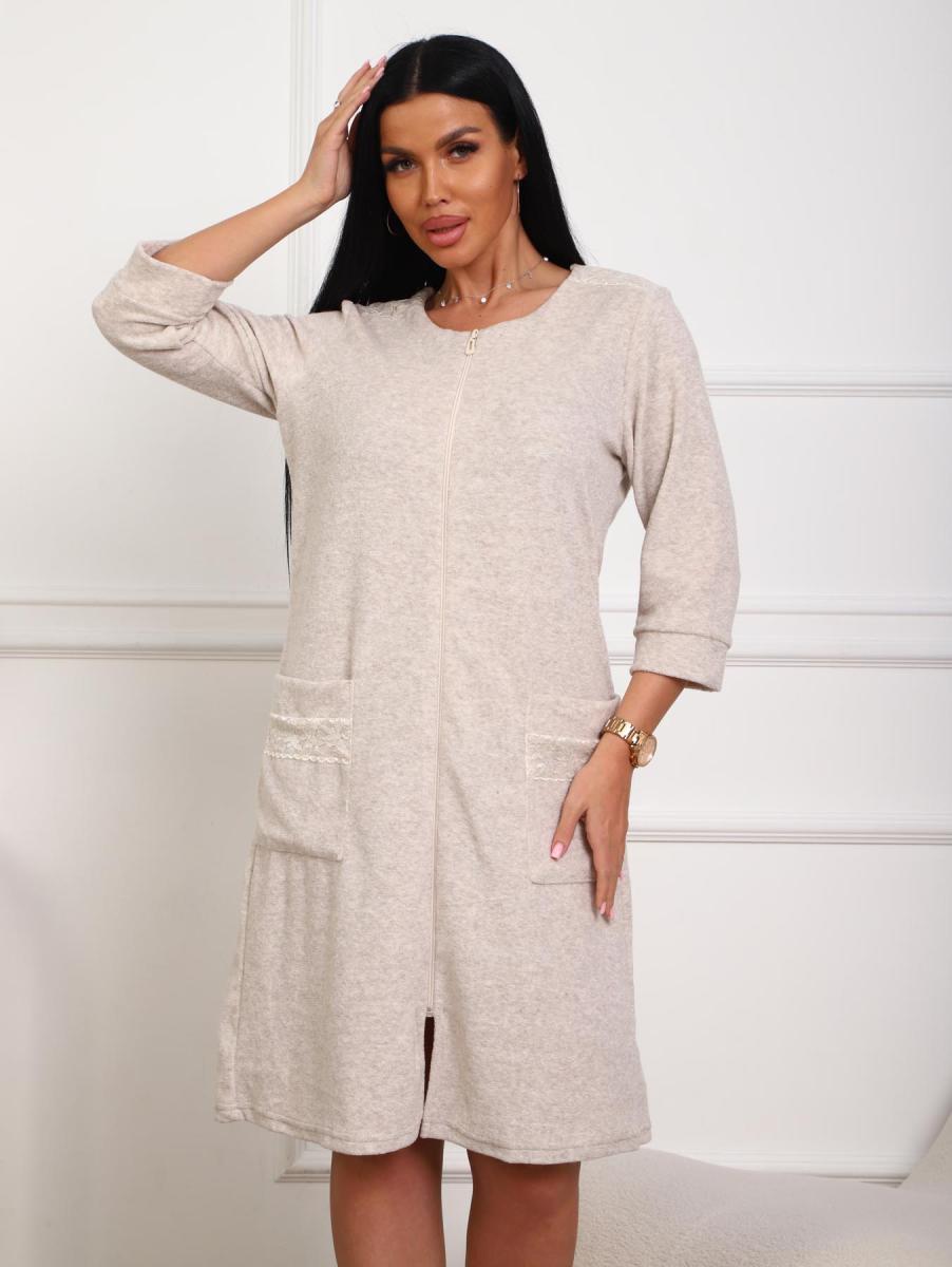 Халат махровый, однотонный на молнии. Отделка - эластичное кружево. Рукав втачной 3/4 с манжетом.