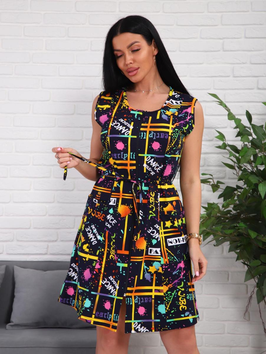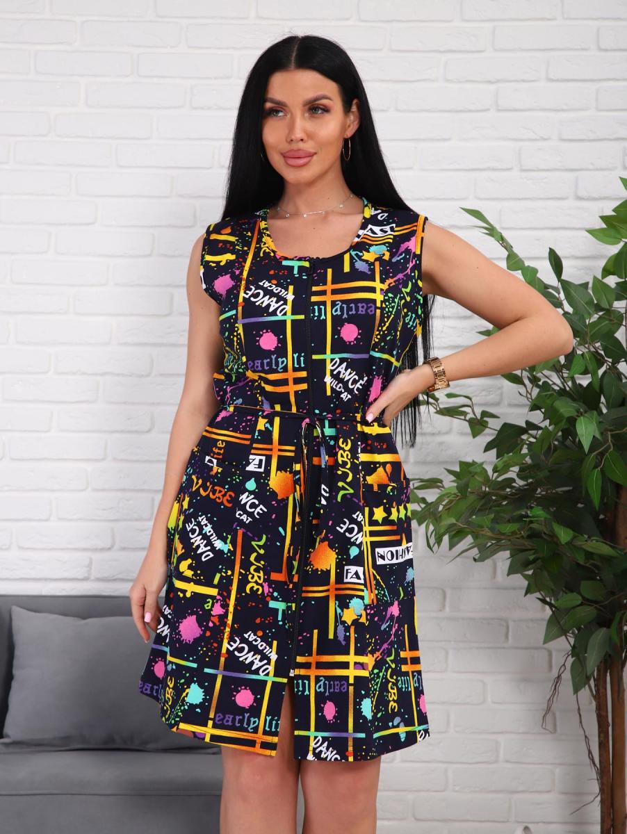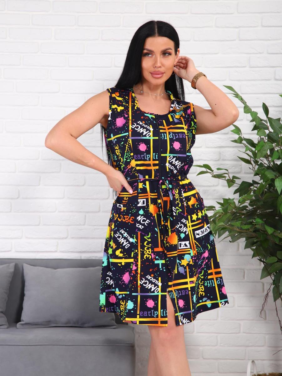 Халат женский, укороченной модели, без рукавов на молнии. В боковой шов с одной стороны вшиты "хлястики" для удобства и завязок. Халат очень хорошо подойдет для домашних дел. Нацелен для весенне-летнего периода.