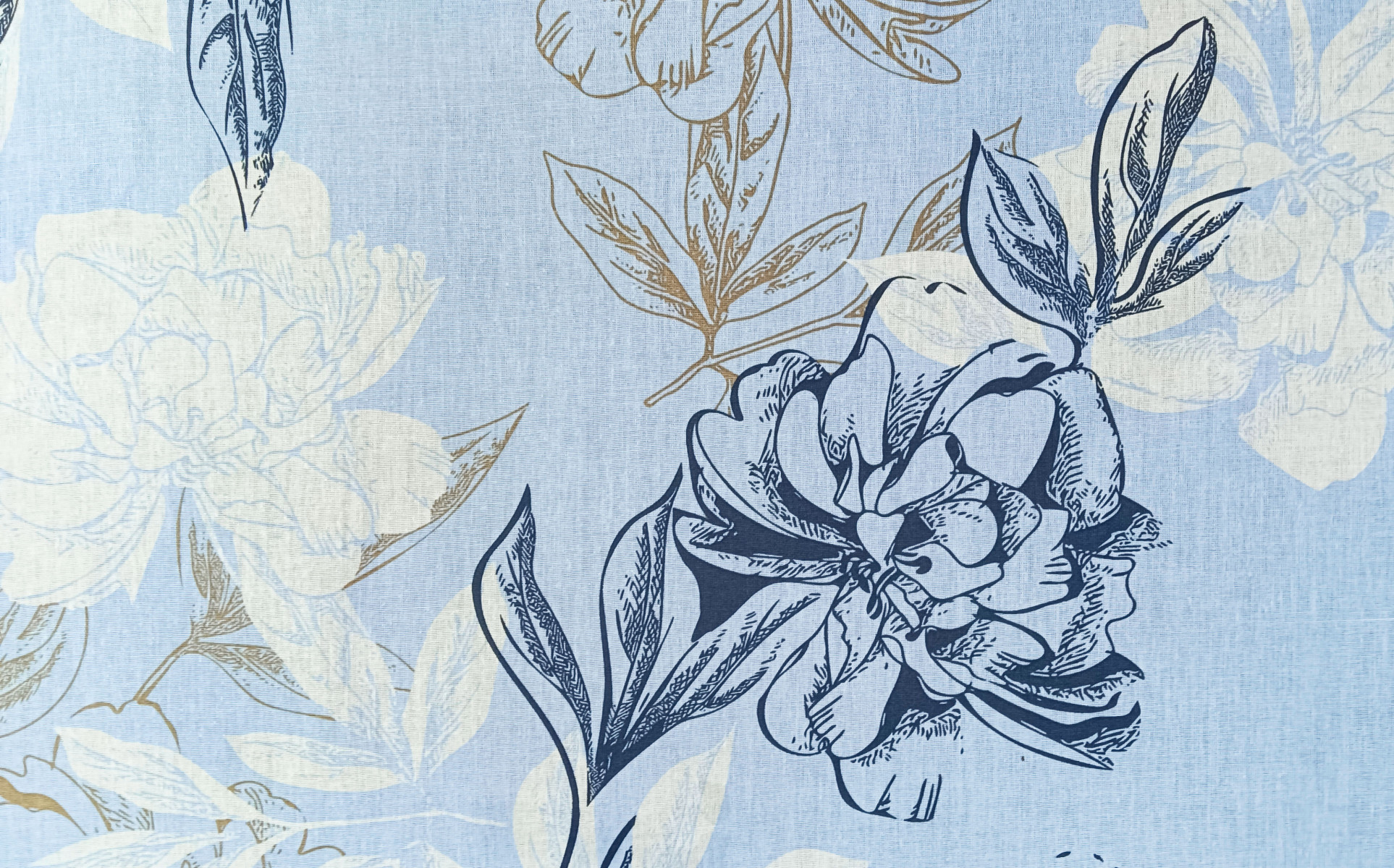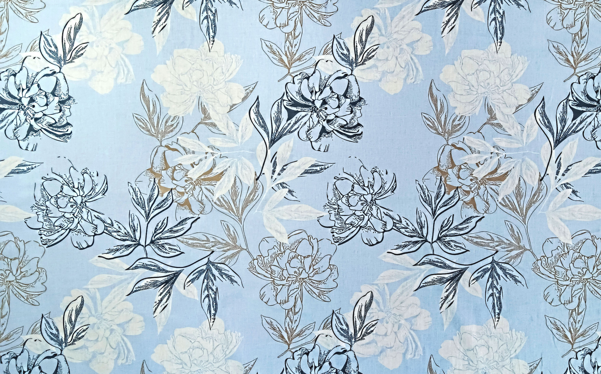Эта ткань выполнена из мягкой и приятной на ощупь бязи, что делает ее идеальным выбором для создания уютных и стильных изделий. Уникальный дизайн с нежными голубыми оттенками и изысканными цветочными узорами добавляет изюминку в любой интерьер.