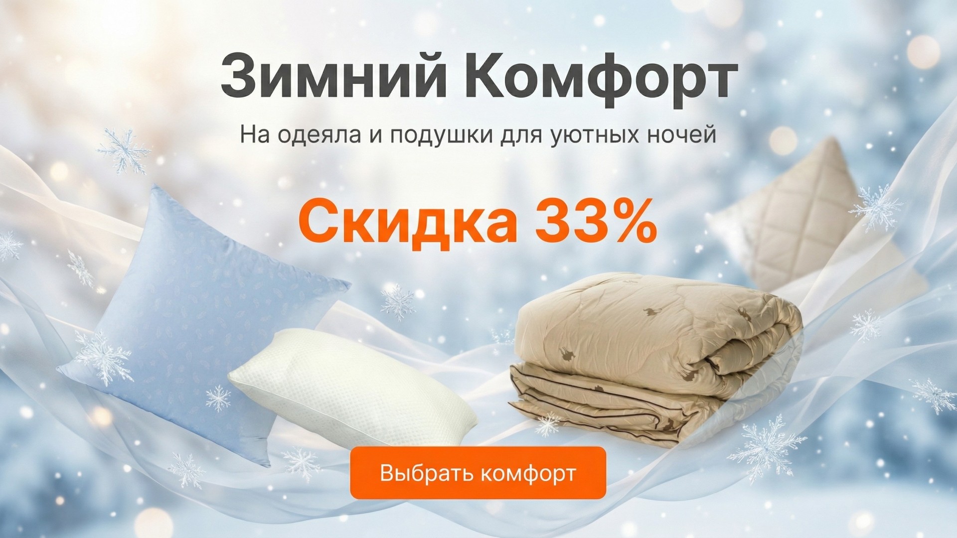 Одеяла и подушки со скидкой 33%. Теплые одеяла различной плотности и удобные подушки для здорового сна. Натуральные наполнители и качественные чехлы обеспечат комфорт в холодные ночи. Создайте идеальные условия для отдыха.
