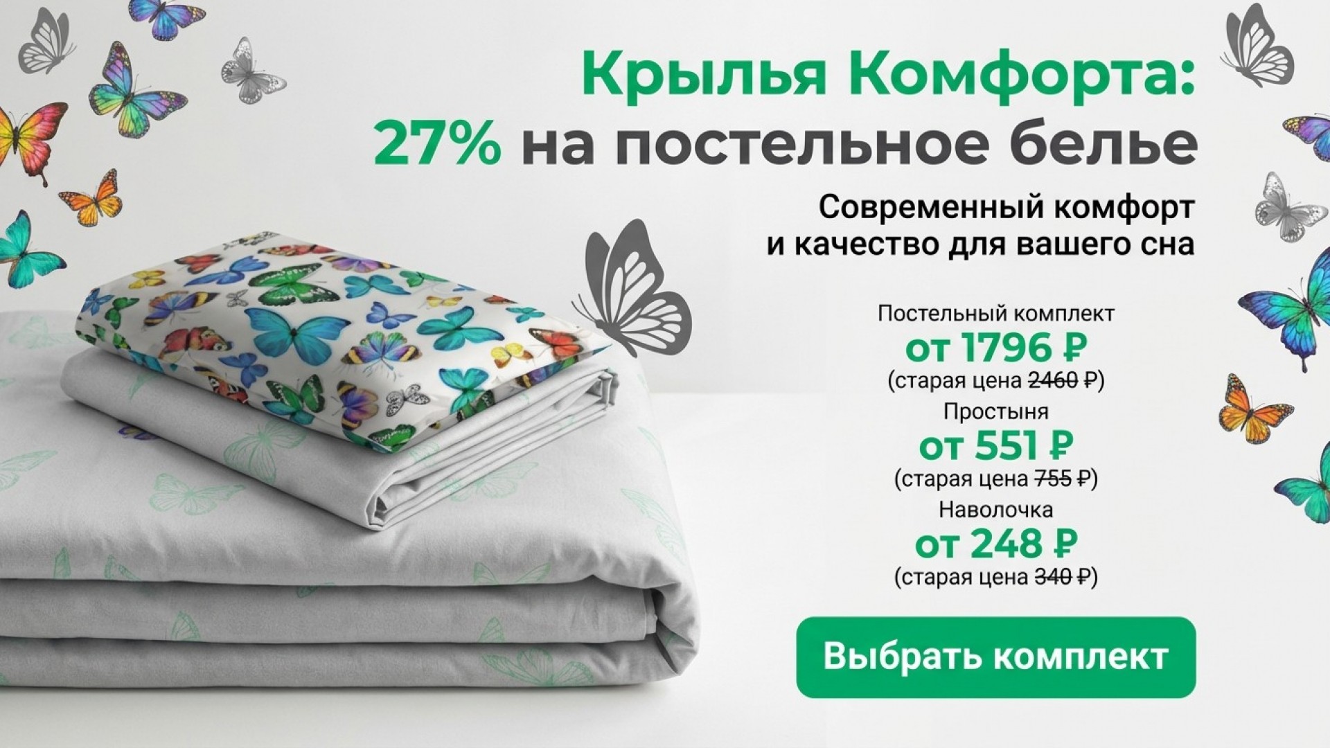 Забудьте о тяжести дня, позвольте себе улететь в мир самых нежных снов, как бабочка, едва коснувшись подушки.Мы знаем, как важен невесомый комфорт, поэтому дарим скидку 27% на наше постельное белье с бабочками.