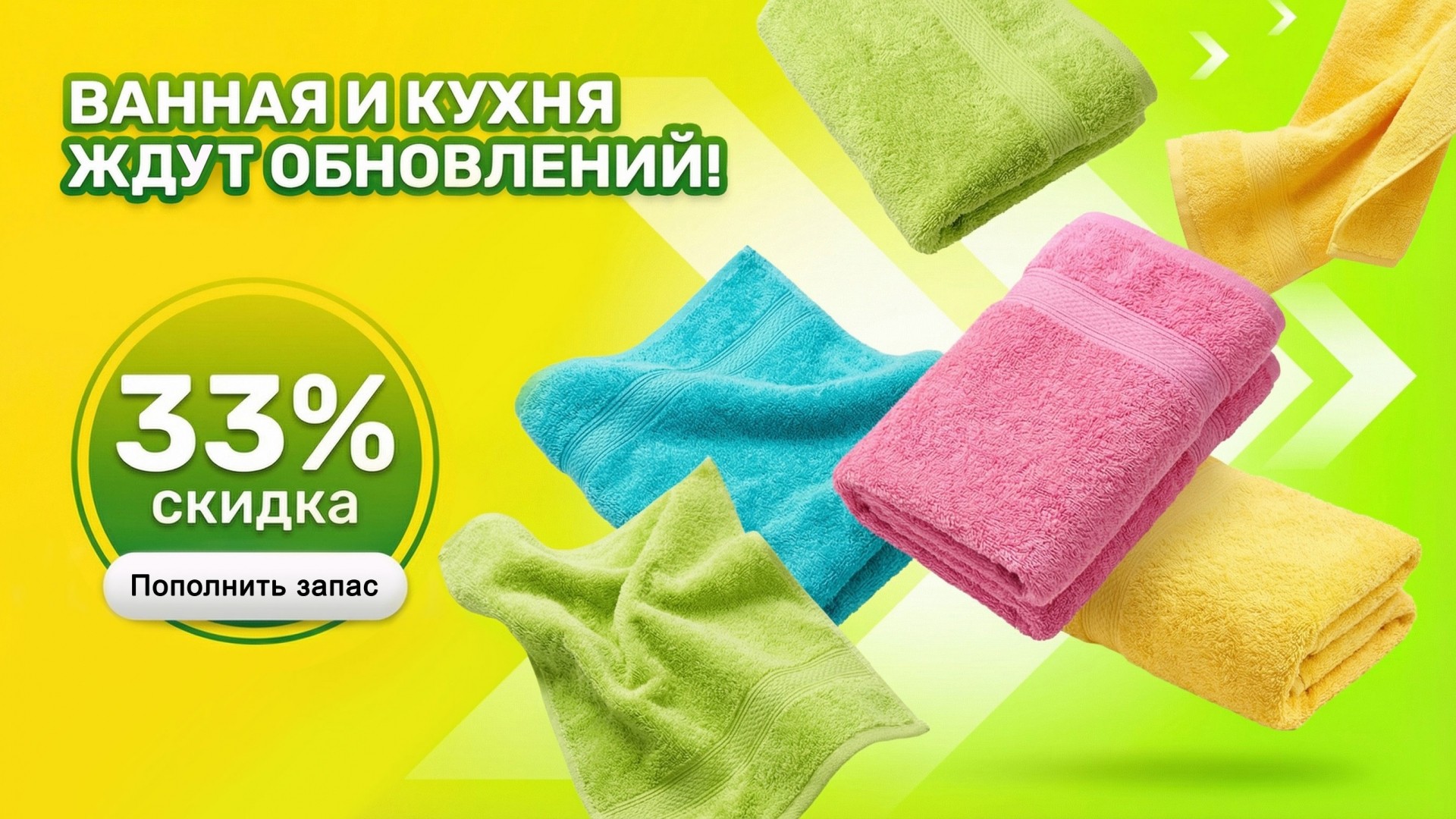 Наконец-то можно без сожаления заменить старые полотенца на новые, сэкономив 33%.Наши полотенца не линяют и не грубеют, а значит, Вам не придется покупать новые целый год. Это покупка, о которой Вы будете вспоминать только с удовольствием.