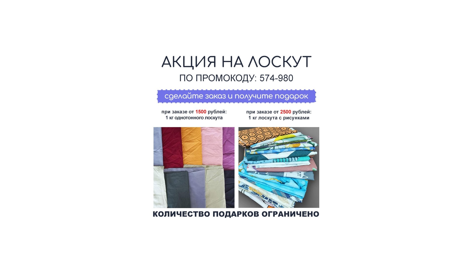При заказе от 1500 рублей мы дарим 1 кг Весового лоскута х/б гладкокрашенного.