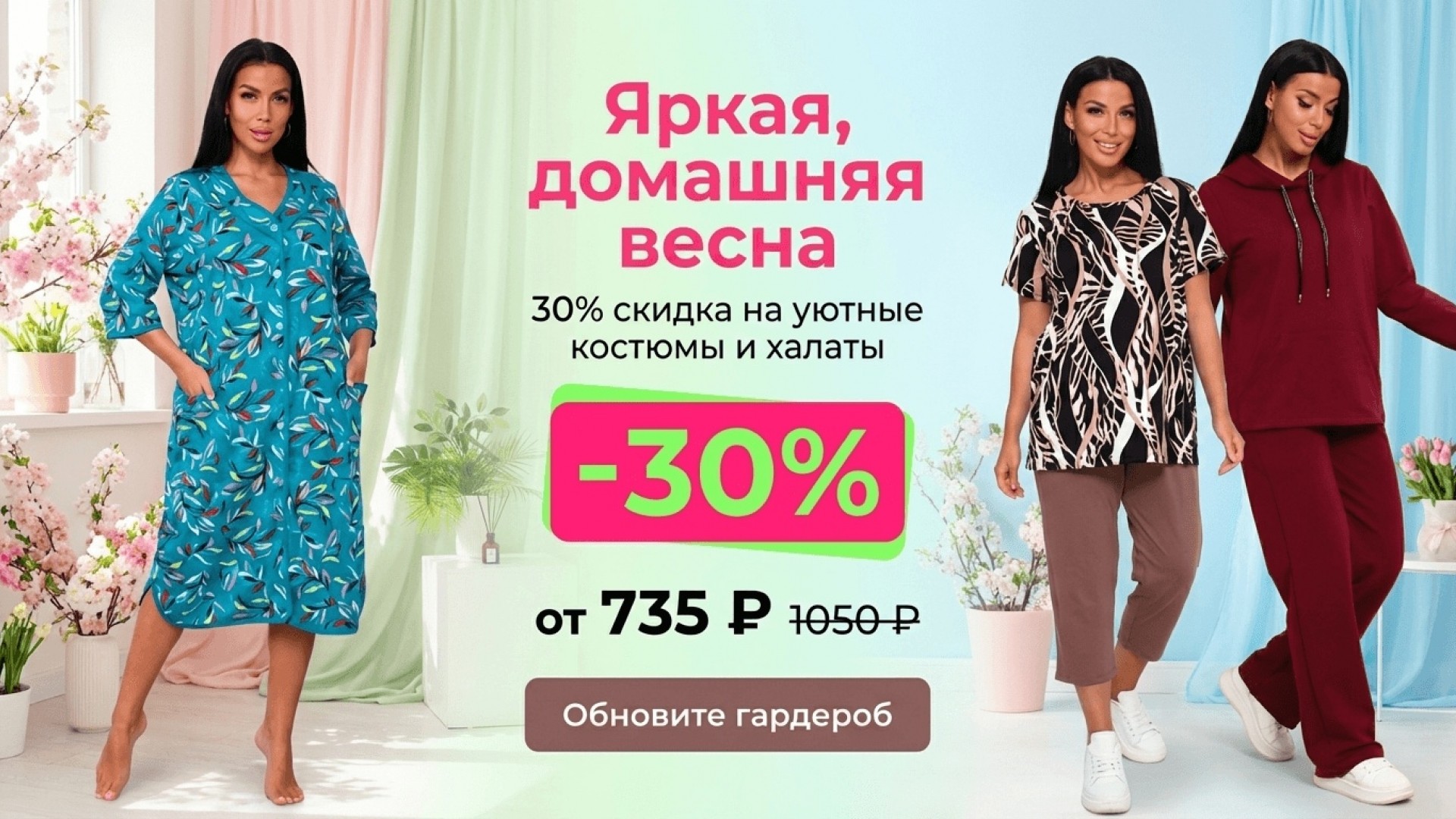 Мы собрали для Вас самые удобные трикотажные костюмы и халаты сочных весенних оттенков. Успейте порадовать себя с приятной выгодой: минус 30% на уютную домашнюю одежду с 20 по 23 марта.