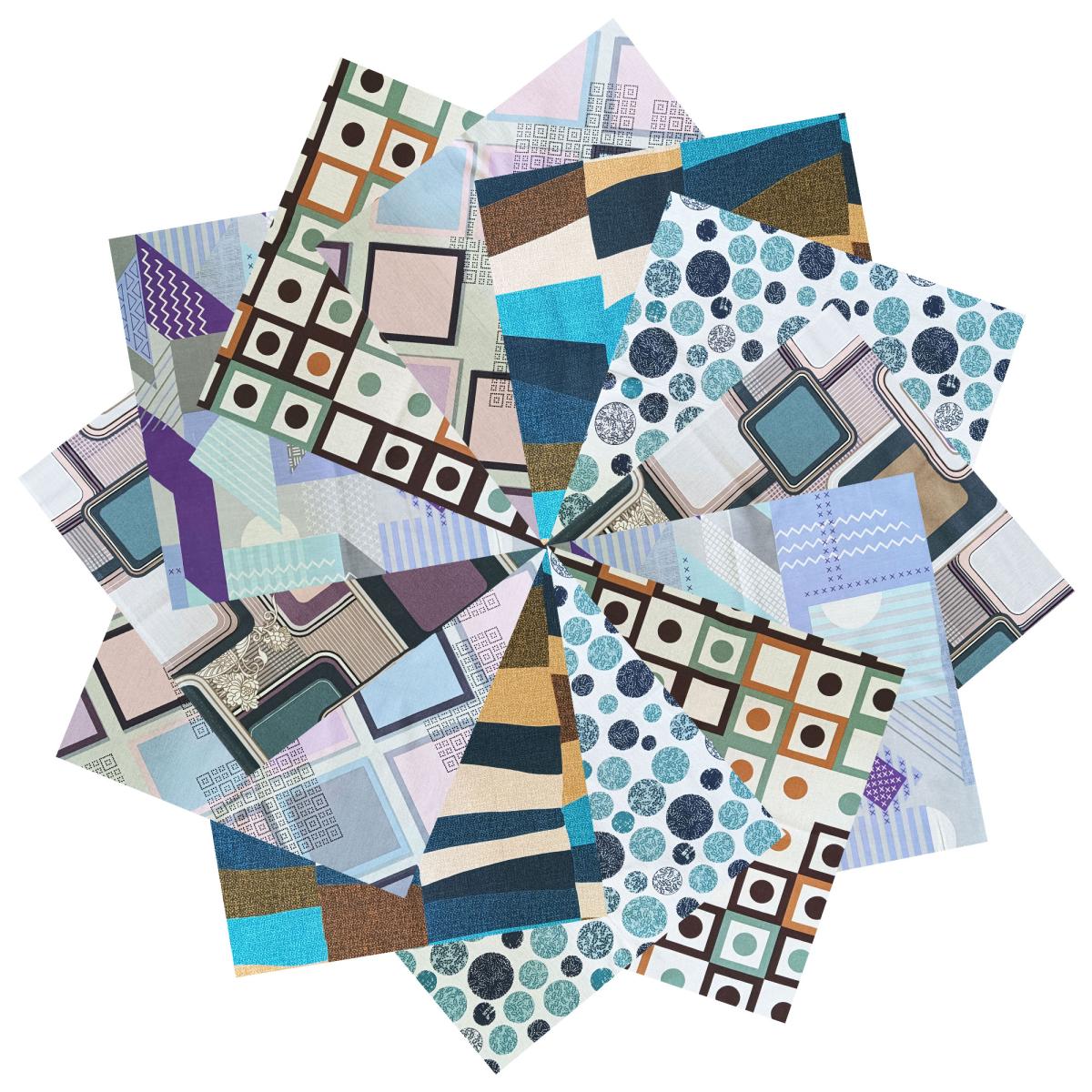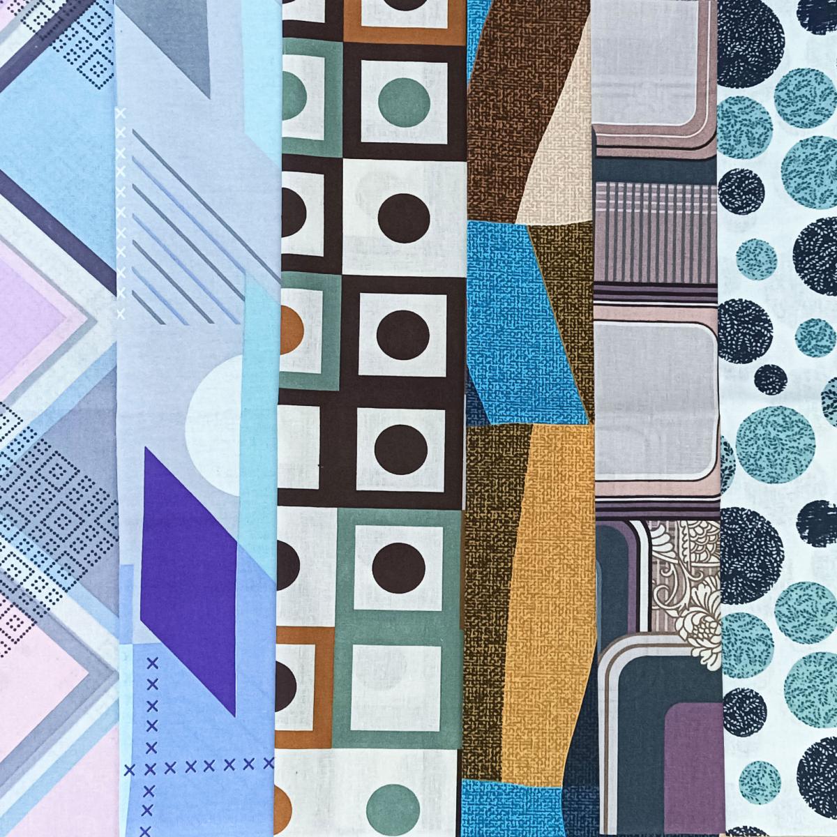 Набор "Пифагор" состоит из 10 лоскутов бязи размером 50*50 см (лоскут может быть чуть больше или чуть меньше указанного размера). В наборе 6 расцветок, по 2 лоскута каждого рисунка.