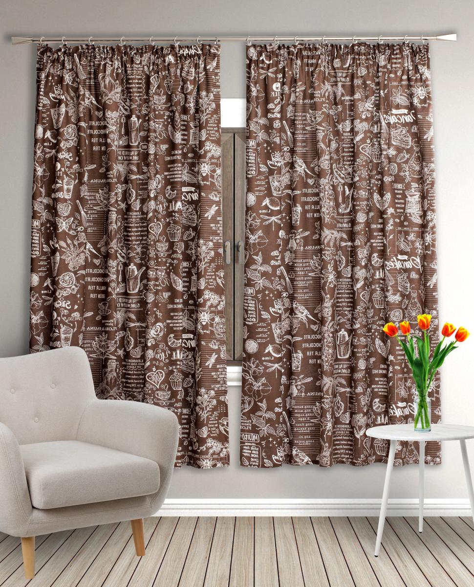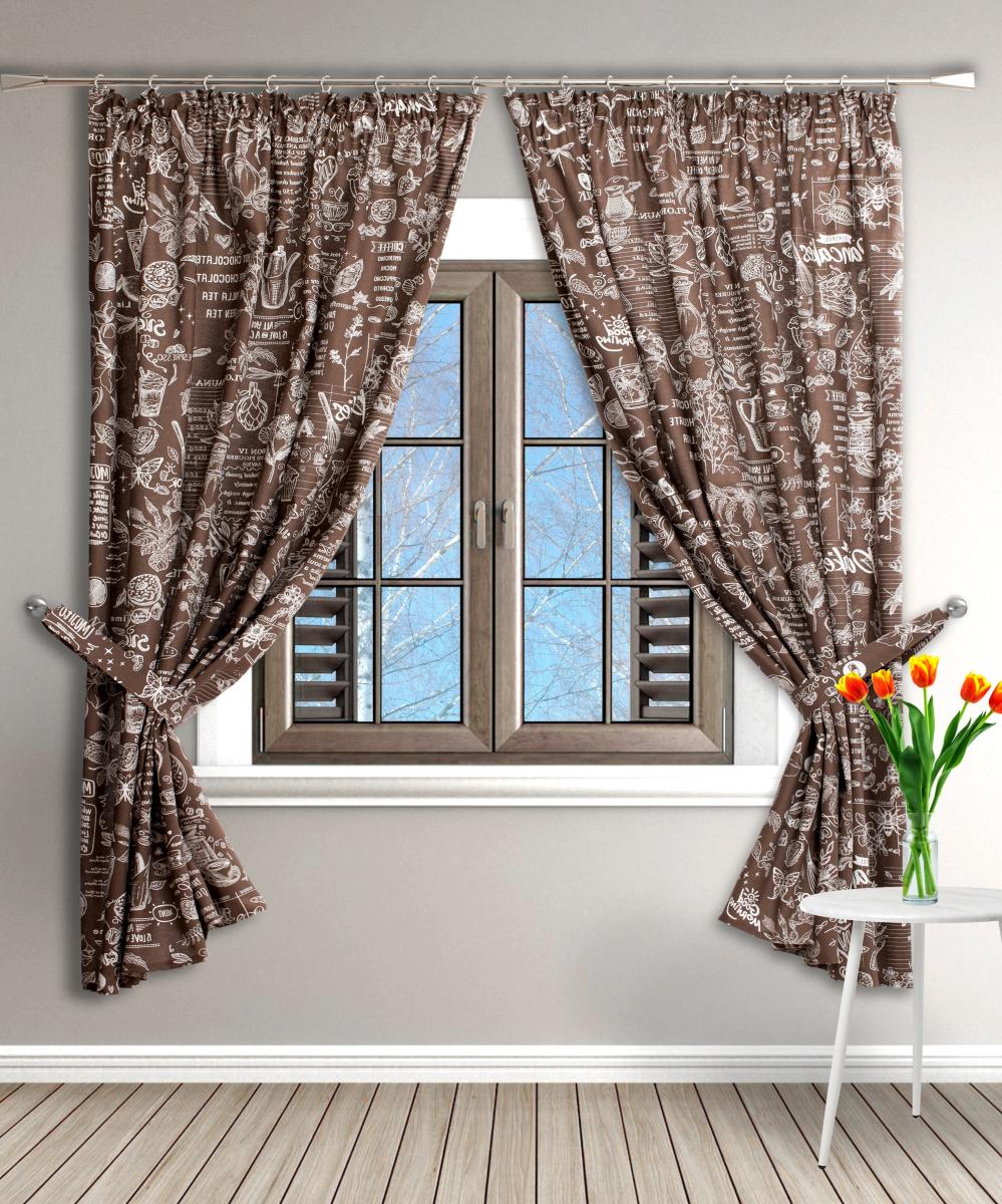 Набор штор состоит из 2-х полотен шириной 145 см и высотой 180 см и 2 подхватов с петлями из того же материала, что и сам комплект.
