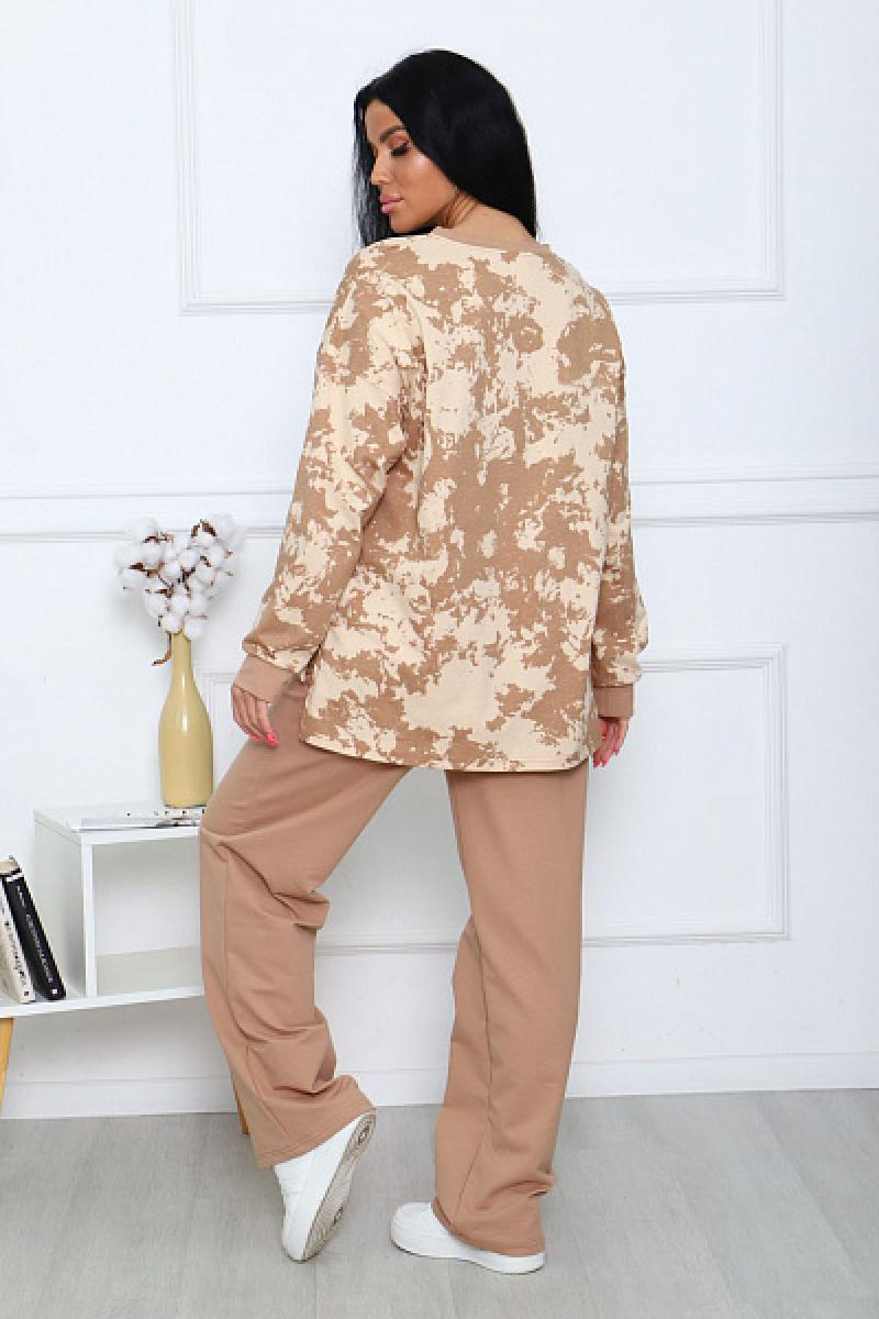 Костюм с брюками в бежевом цвете – идеальный выбор для домашнего уюта и отдыха. Изготовленный из мягкого футера с лайкрой, этот комплект обеспечивает комфорт и свободу движений. Толстовка с длинным рукавом имеет манжеты и удлинённый низ спинки с боковыми разрезами, что придаёт ей стильный вид. Принт на полочке добавляет изюминку, а свободный крой позволяет сочетать её с любыми брюками.